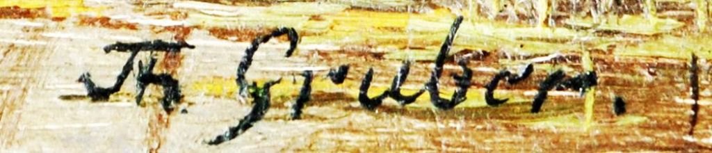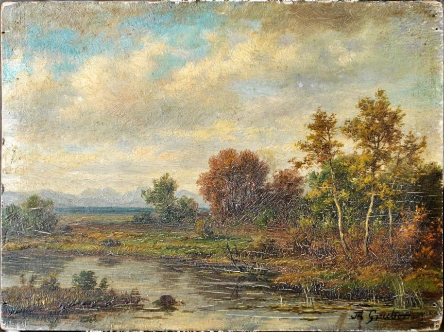 Gruber, Th. (19. årh.) Tyskland: Landskab. Signeret: Th. Gruber. Olie på træ. 12 x 16 cm.