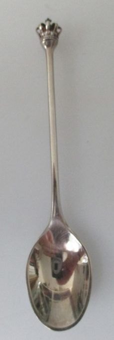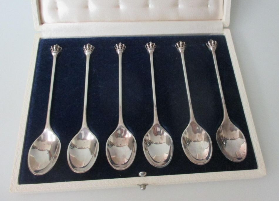 Samling sterling sølv theskeer i æske, 20. årh. Danmark. I alt 6 stk. Dekoreret med dansk kongekrone. Længde: 10,5 cm.