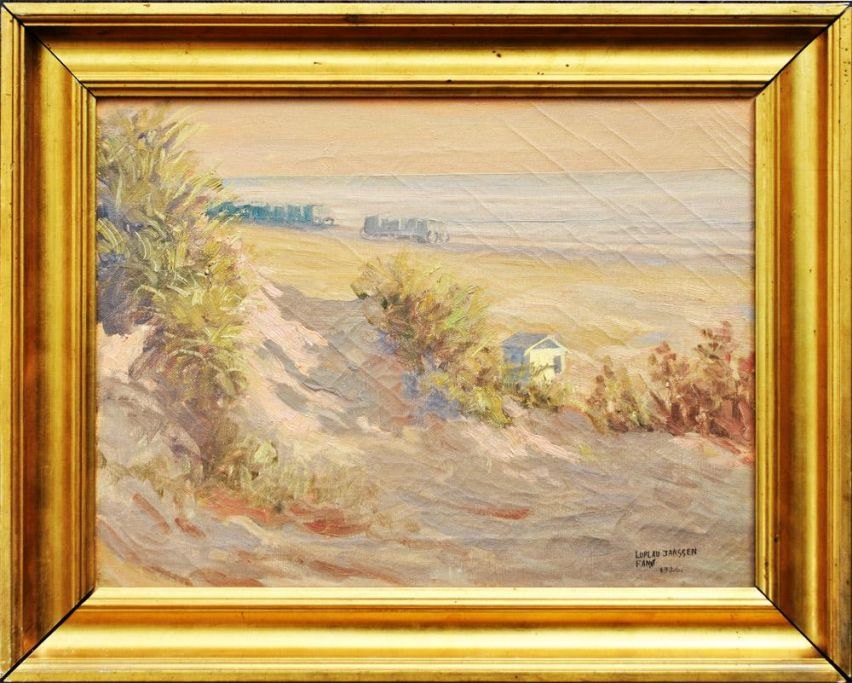 Luplau Jansson (1869 - 1927): Badehuse på stranden, Fanø. Olie på lærred. Sign.: Luplau Jansson 1926. 30 x 40 cm.