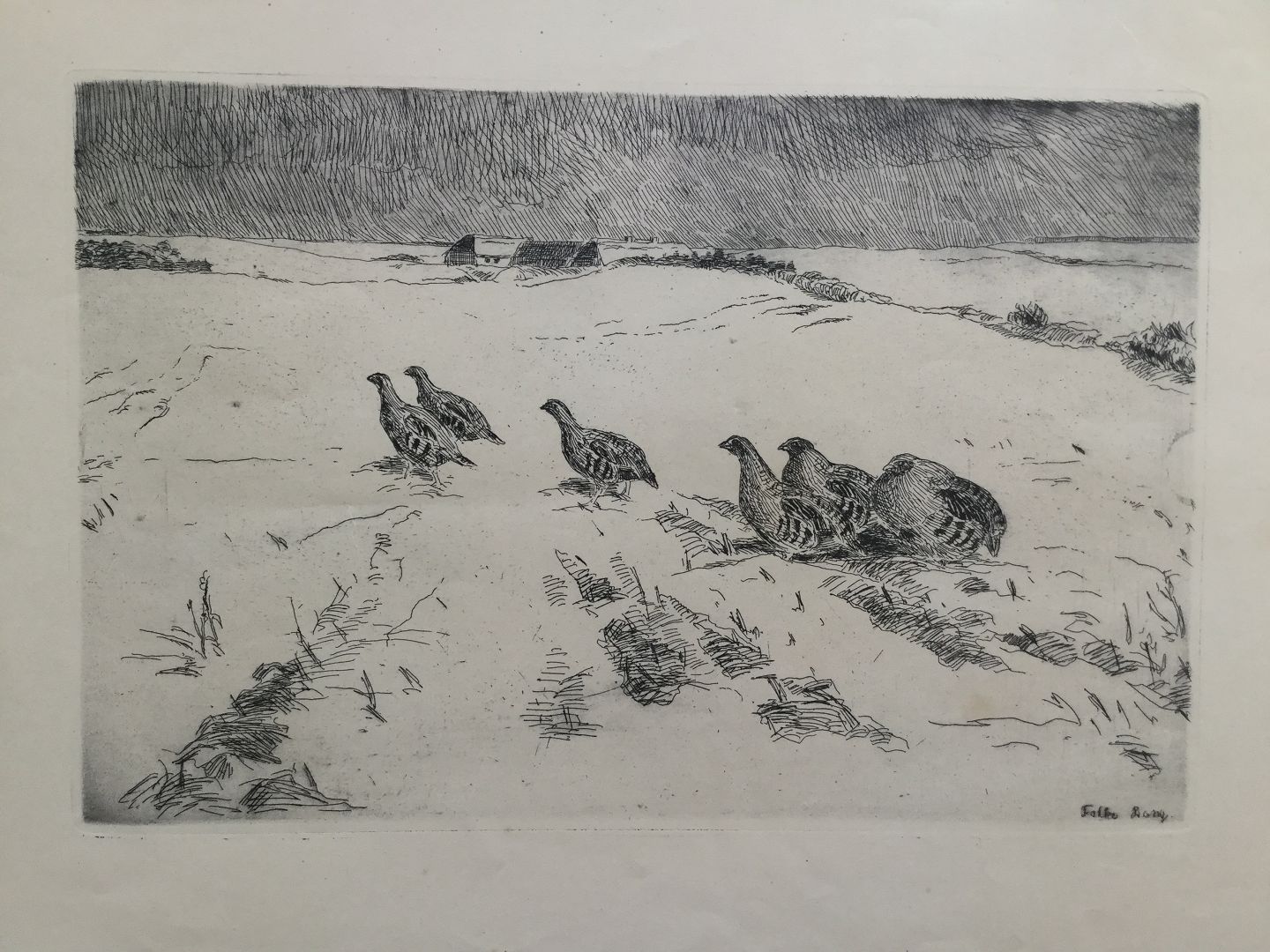 Radering af Falke Bang - Vinterlandskab med agerhøns.