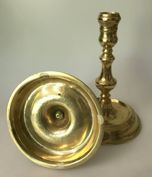 Par danske messing stager, Næstved type, 18./19. årh. Rund fod med profileret stamme. Højde: 16,5 cm.