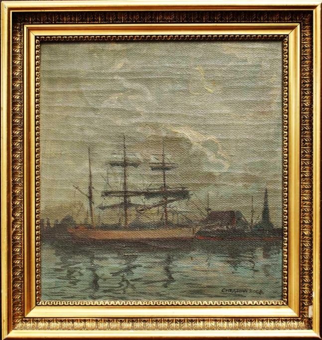 Bogø, Christian (1882 - 1945) Danmark. Skibe i havn. Signeret. Olie på lærred. 41 x 39 cm.