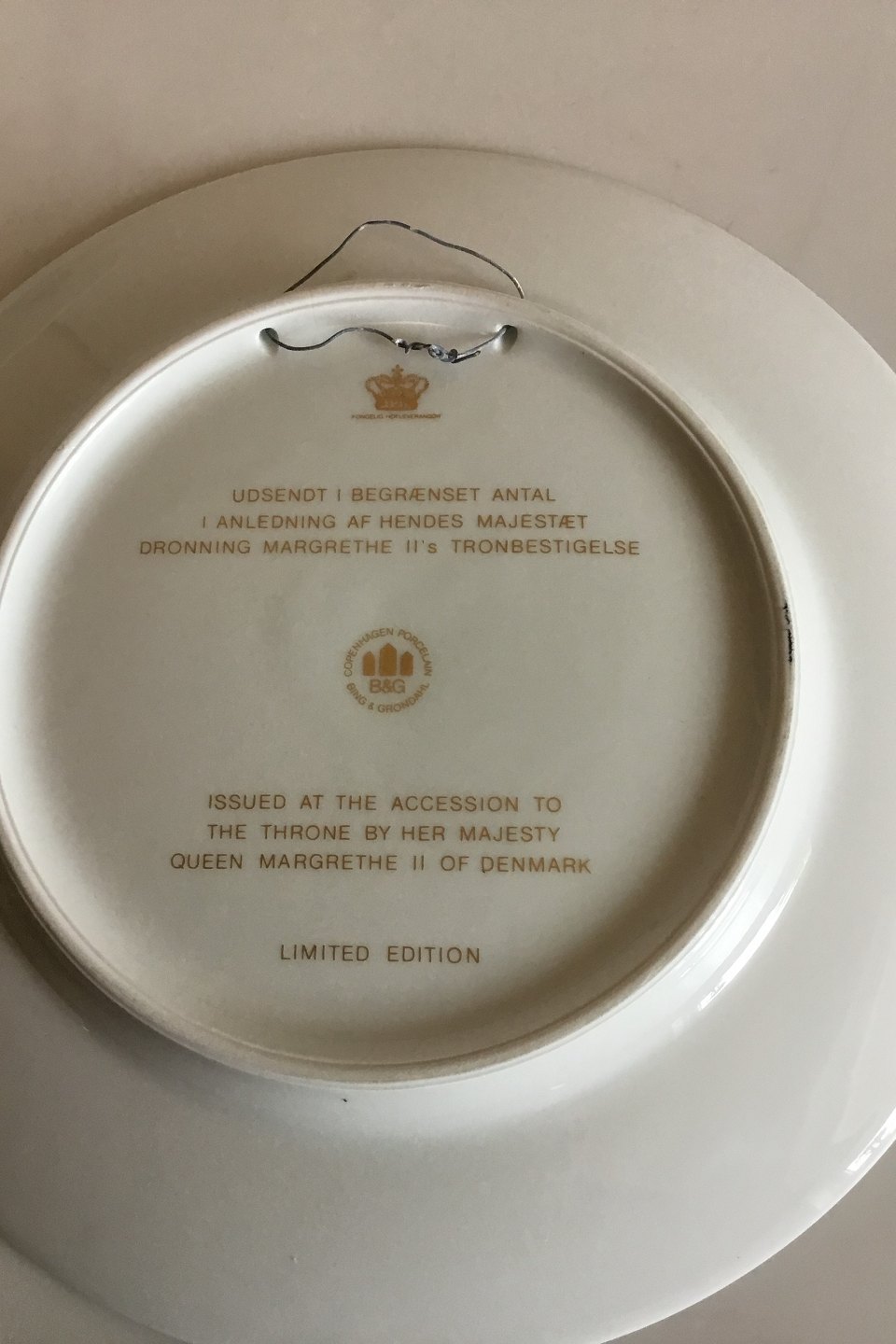 Bing og Grøndahl Platte Danmarks Dronning Margrethe II. I anledning af Tronbestigelsen 14 januar 1972. Måler 24 cm dia. / 9,44 in.
