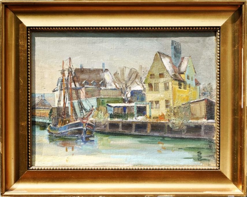 Sinding Christensen, Svend (1898 - 1980) Danmark: Kanal parti. Signeret.: Monogram. Olie på lærred. 25 x 34 cm.