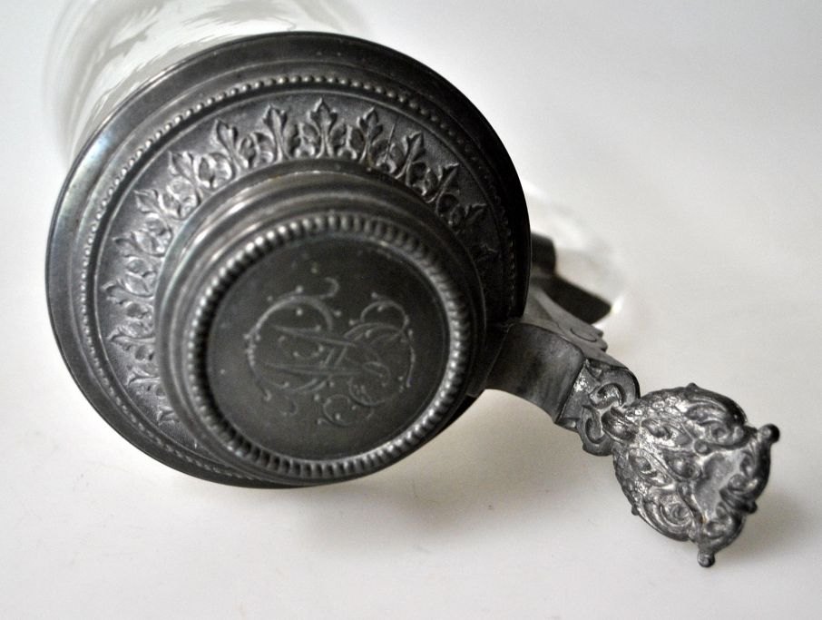 Antik tysk drikkekrus i glas med slibninger og tin låg, 19. årh. 0,5 liter. Slebet dekoration i form af hjort i skov. Tin låg med dekorationer og monogram. Gæk med to fisk. Højde.: 20 cm.