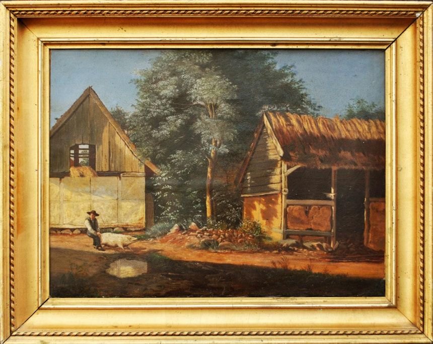 Bøgh, Carl (1827 - 1893) Denmark: A boy, holding a pig in it's tail at an old farmhouse. Oil on paper / canvas. 37 x 50 cm. Unsigned. On the streacher several numbers from different auctions. In decorated gold frame.