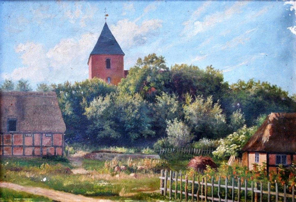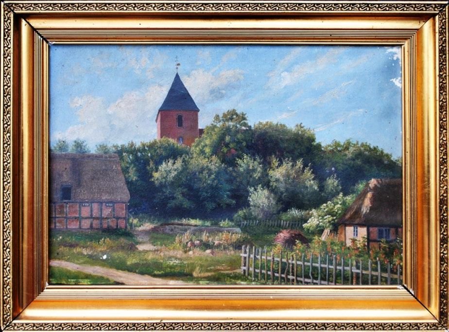 Dansk kunstner (20. årh.) En landsby med kirke. Olie på lærred. 30 x 43 cm.