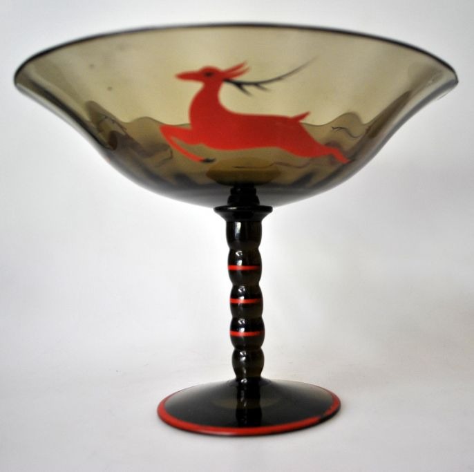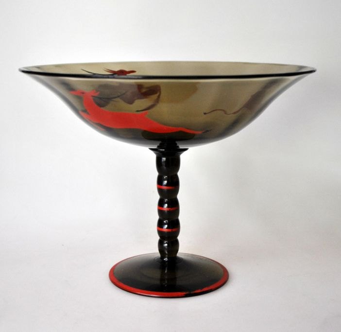 Glas opsats på fod, røgfarvet, art deco, 20. årh. Dekoreret med rødt/sort emalje maleri af springende hjort. Højde.: 15,5 cm. Dia. skål: 20,5 cm.
