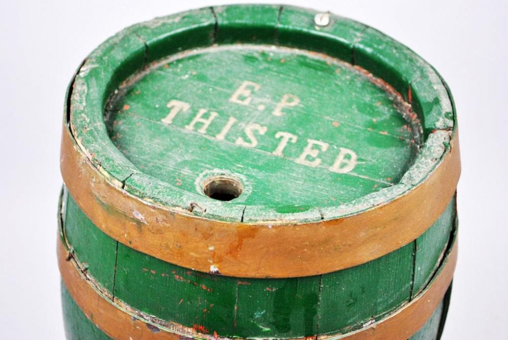 Antik grøn malet øl anker, 19. årh. Thisted, Danmark. Med indgravering: E.P. Thisted. H: 32 cm. Dia: 28 cm.