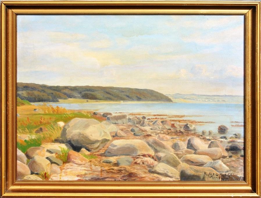 Graversen, N. (20. årh.) Fjord. Olie på lærred. 49 x 64 cm. Signeret: N. Graversen 1938