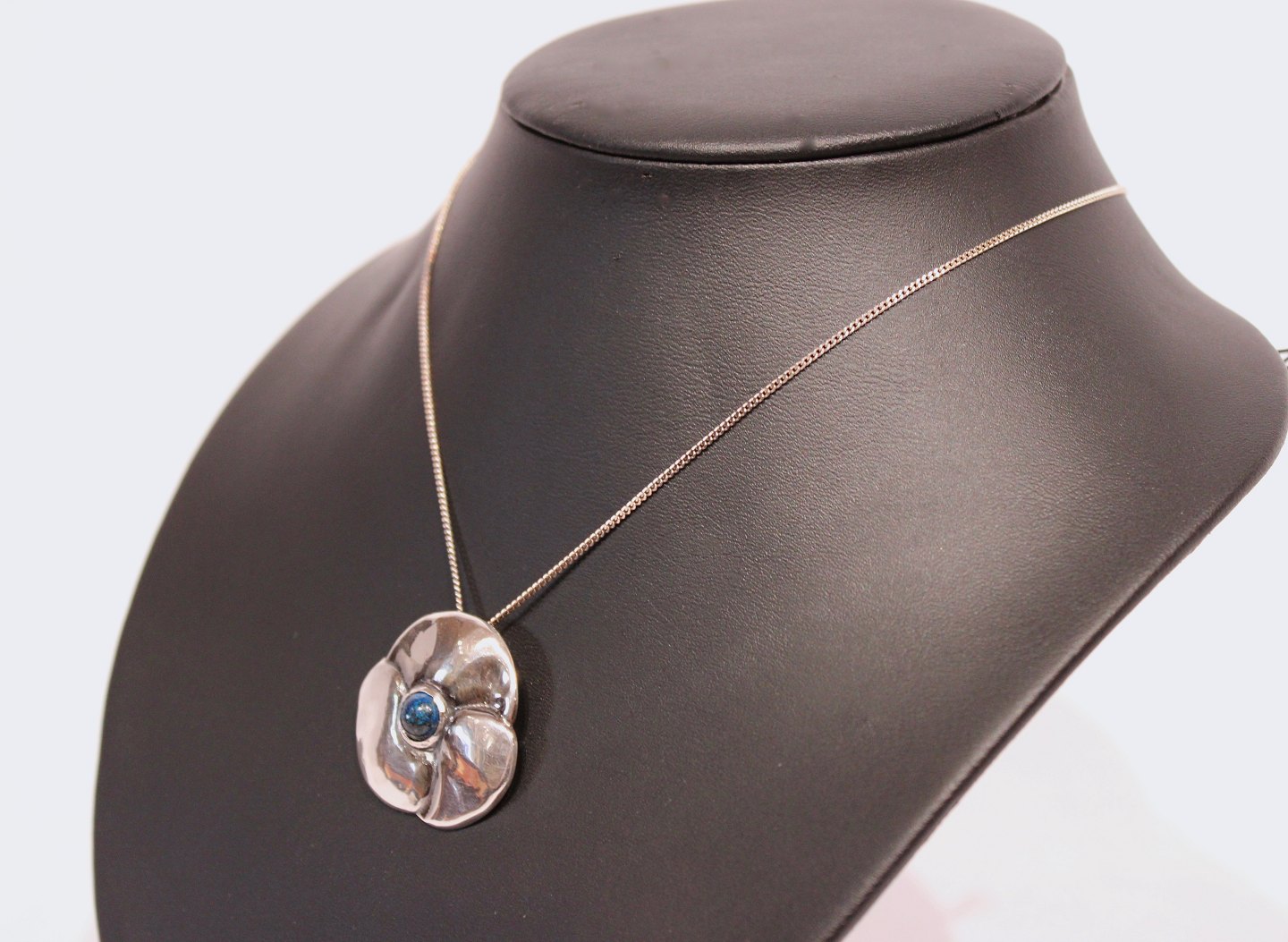 Rundt vedhæng med blå sten af 830 sølv. Lignende kæde kan købes seperat.