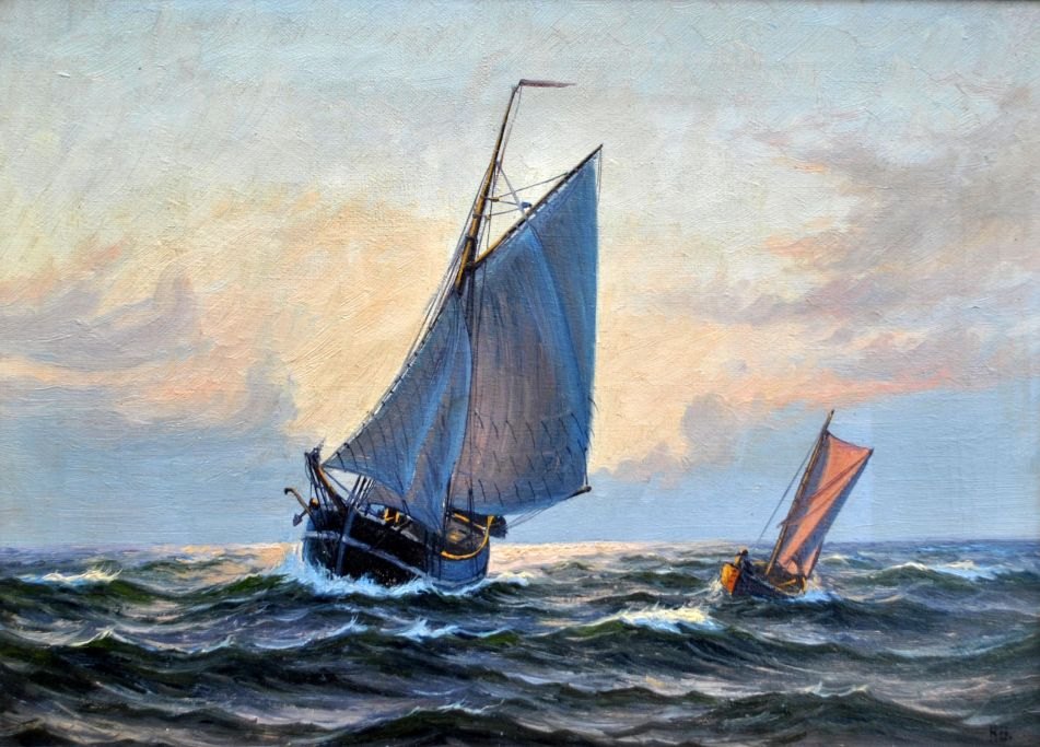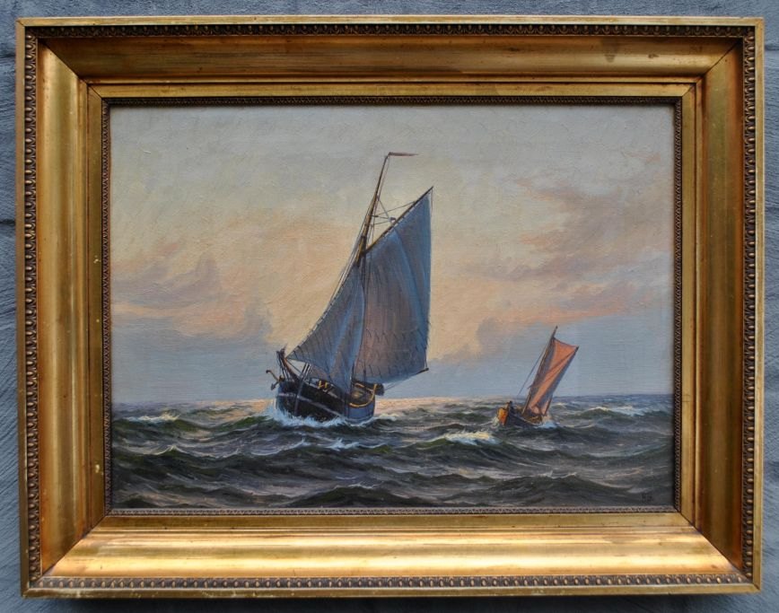 Bülow, A. (19./20. årh): Kvase for hjemgående i stor Kuling. Aften. Kattegat. Olie på lærred. Signeret: AB. 33 x 45 cm.