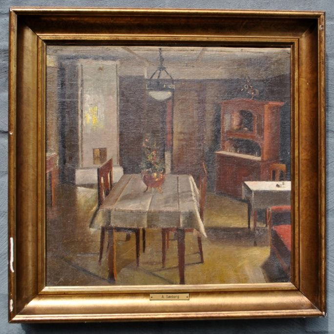 Søeborg, Axel (1872 - 1939) Danmark: Interiør. Olie på lærred(opklæbet på lærred.. Signeret.: Monogram 30. 40 x 40 cm.