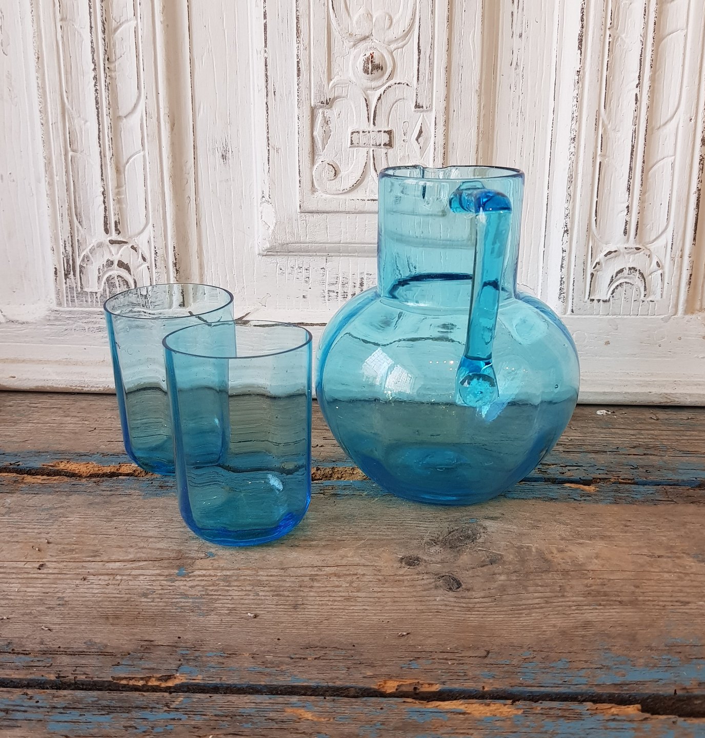 Søblå vandkande med 2 vandglas fra Fyens glasværk