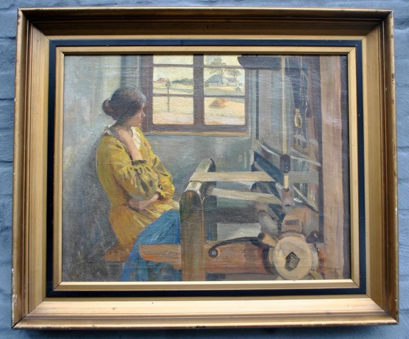 Sørensen, Eiler (1869 - 1953) Danmark: En ung kvinde ved en væv. Olie på lærred. Signeret: Eiler Sørensen 1929.48 x 60 cm.