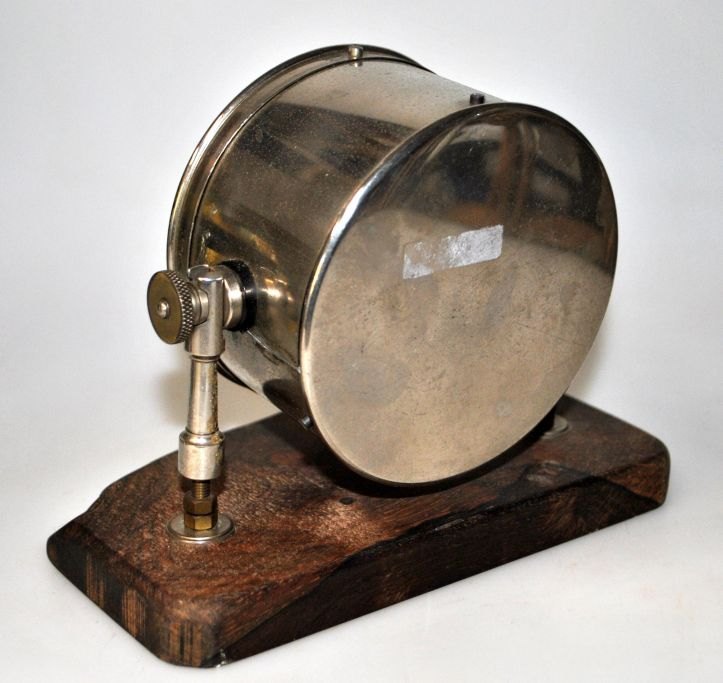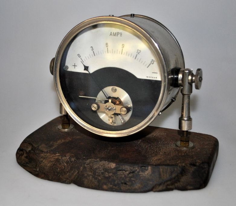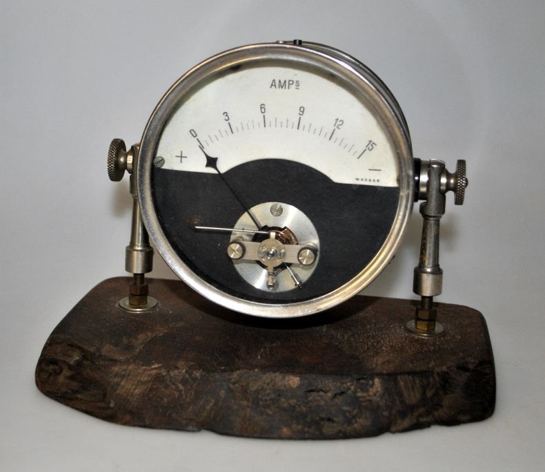 Ampere meter, tidlig 20. årh. Monteret på træ fod. Har været anvendt til målinger indenfor bilindustrien. Højde: 14,5 cm. B.: 18 cm.