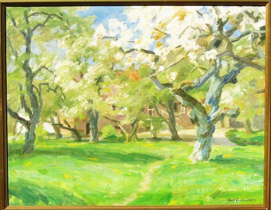 Frederiksen, Axel (1881 - 1961) Danmark: Blomstrende træer i en have - forår. Olie på lærred. Sign.: Axel Frederiksen. 46 x 58 cm.