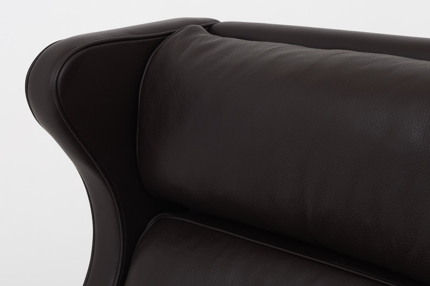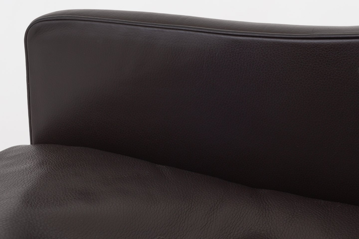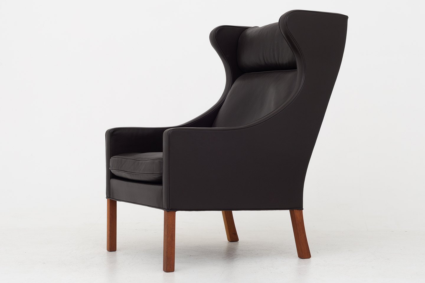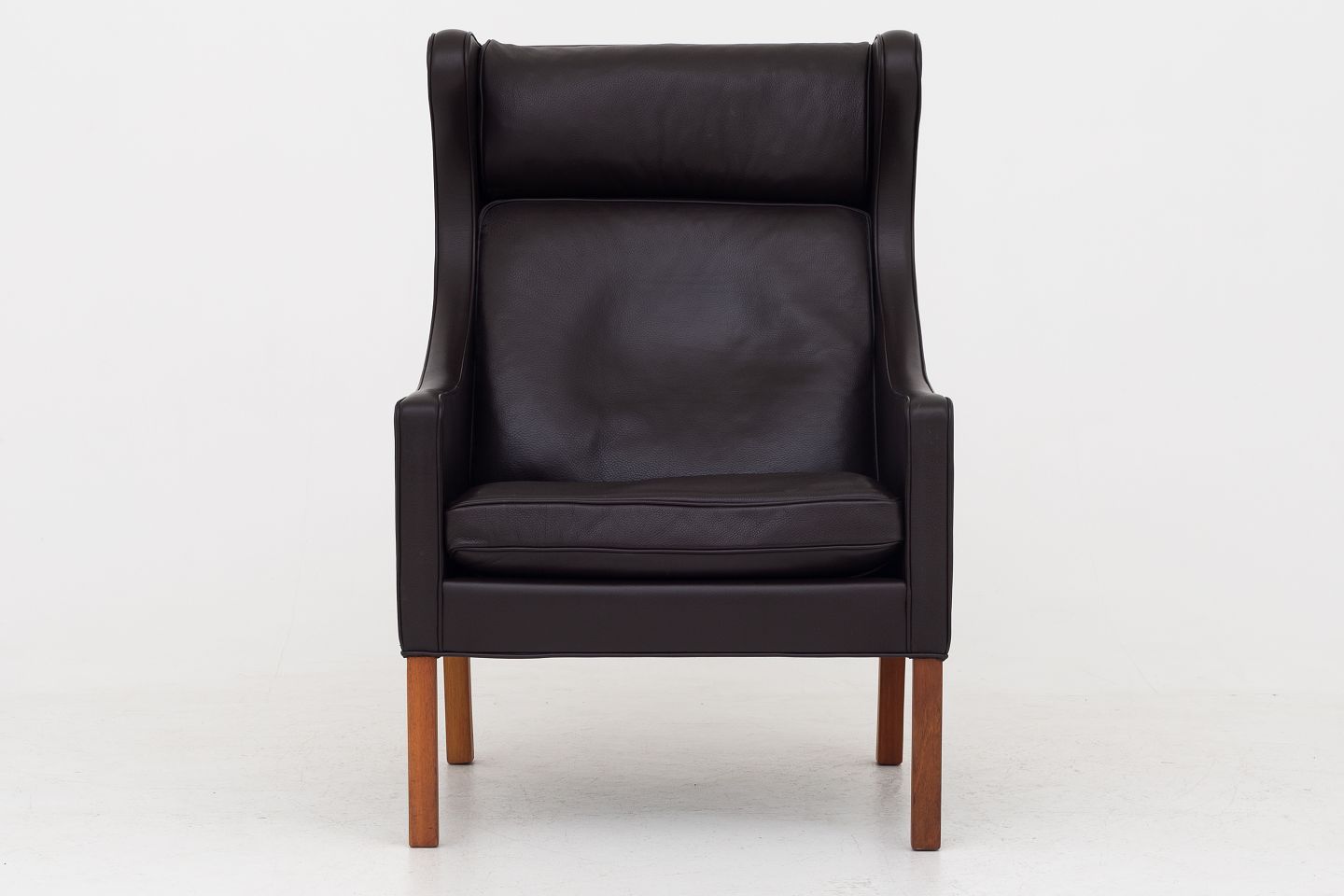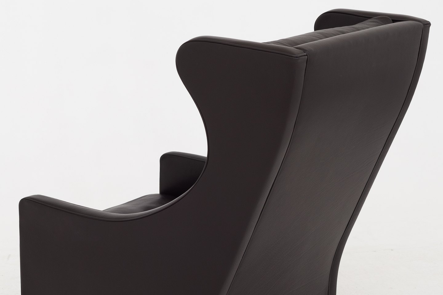 BM 2204 - Reupholstered Wing-back chair in Paris Brown leather w. legs of teak. We can offer upholstery of the chair in fabric or leather of your choice. Please contact us for further information.