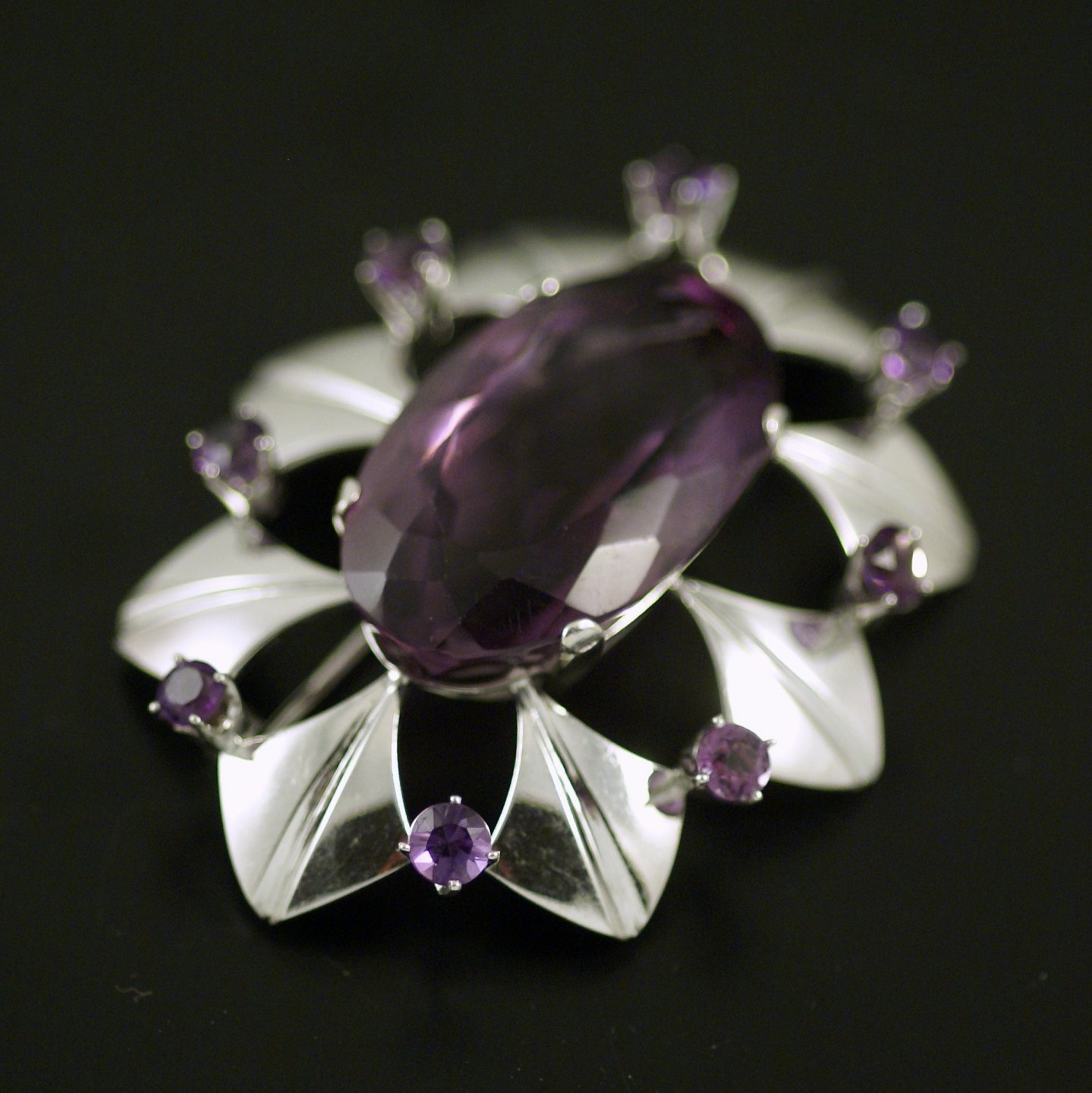 Karen Strand 1924-2000. Broche i 18k hvidguld med ametyst.