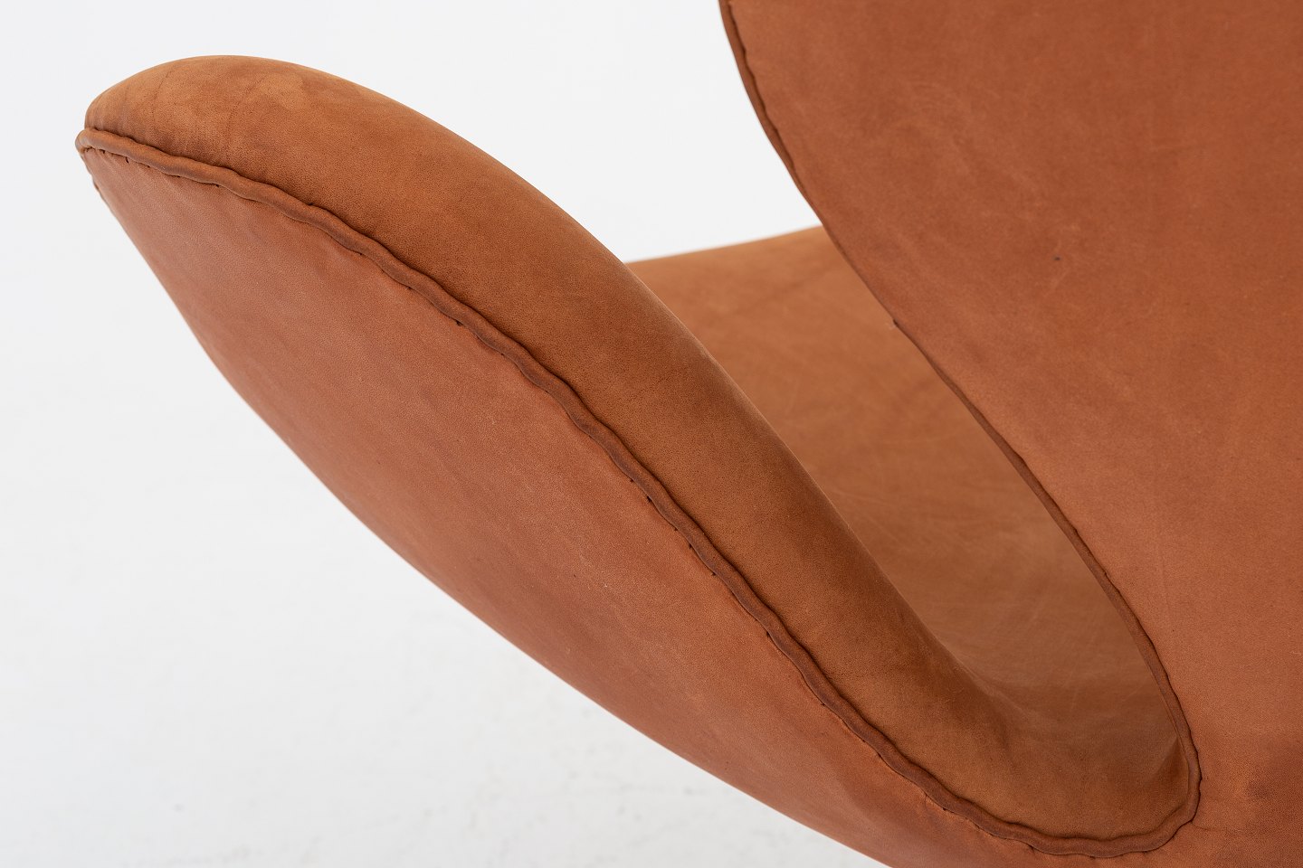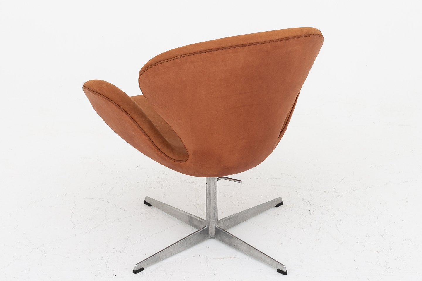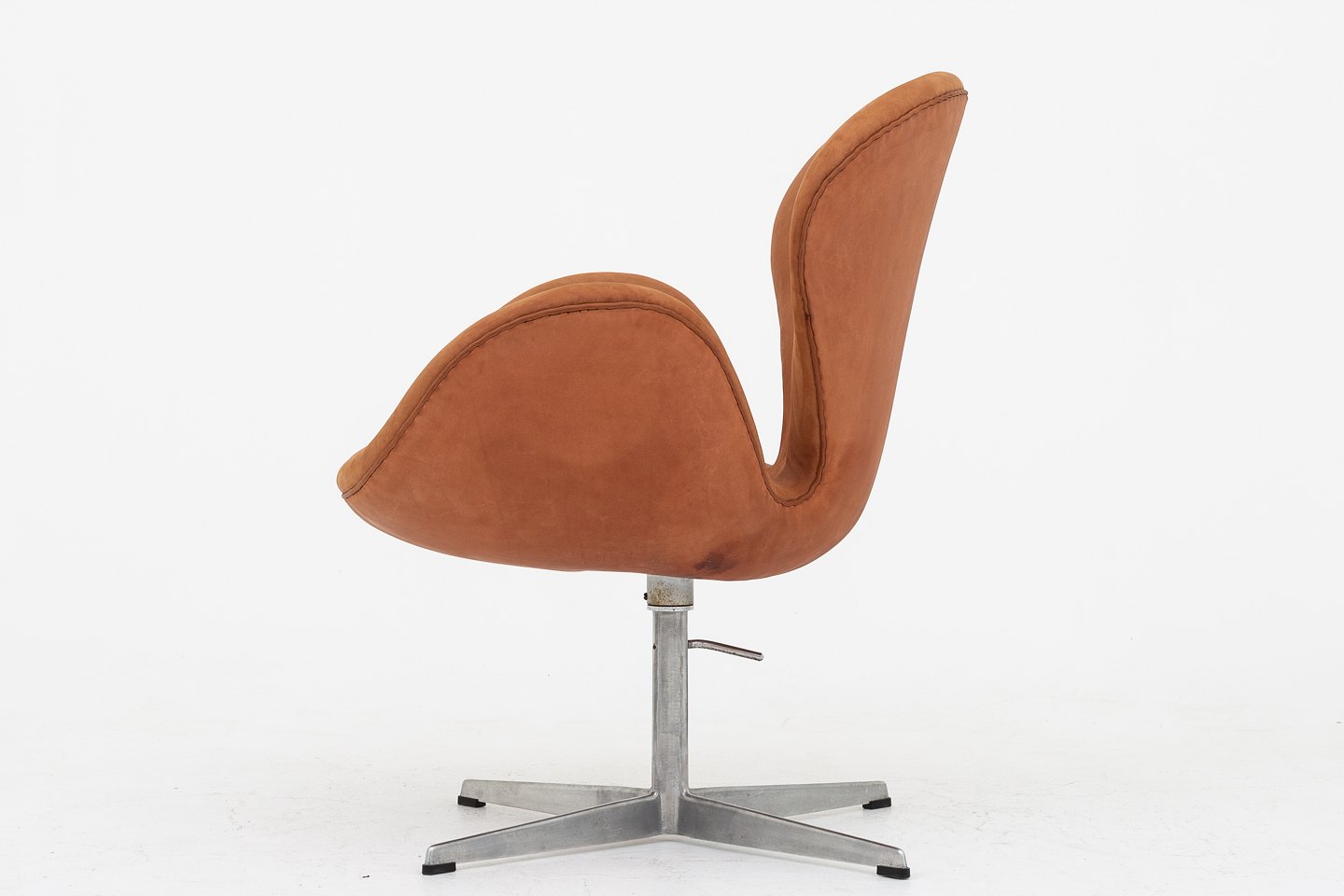 AJ 3320 - Nybetrukket "Svanen" i Dunes Rust-læder på gl. fod og med højdejustering. Vi tilbyder polstring af Svanen med stof eller læder efter eget valg. Kontakt os venligst for mere information.