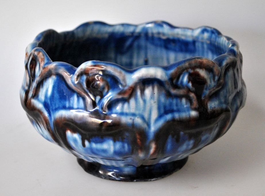 Skål, Roskilde Lervarefabrik, ca. 1920, Danmark. Keramik. Med blåt og brunt glasur. H.: 9 cm. Dia.: 15 cm. Stemplet i bunden: no. 100.