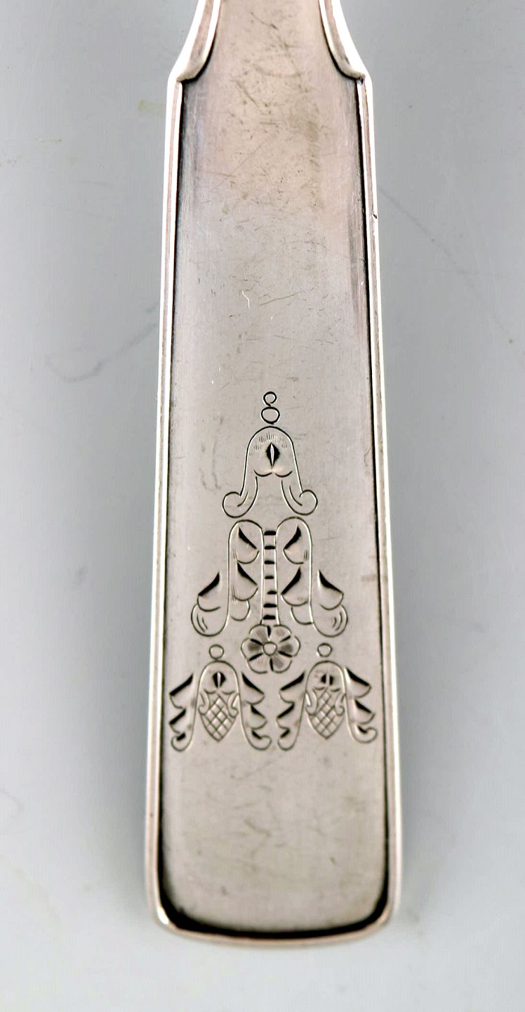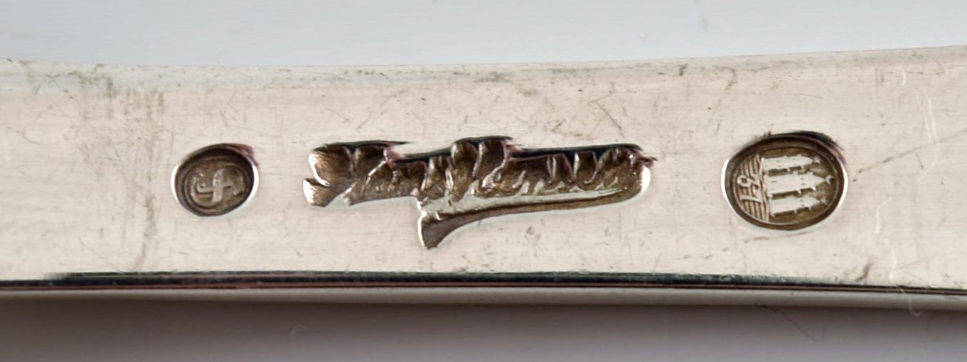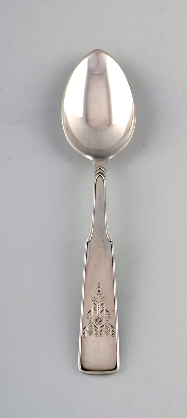 Hans Hansen sølvtøj Arvesølv nr. 2. 13 stk dessertskeer i 3-tårnet helsølv. 1937.