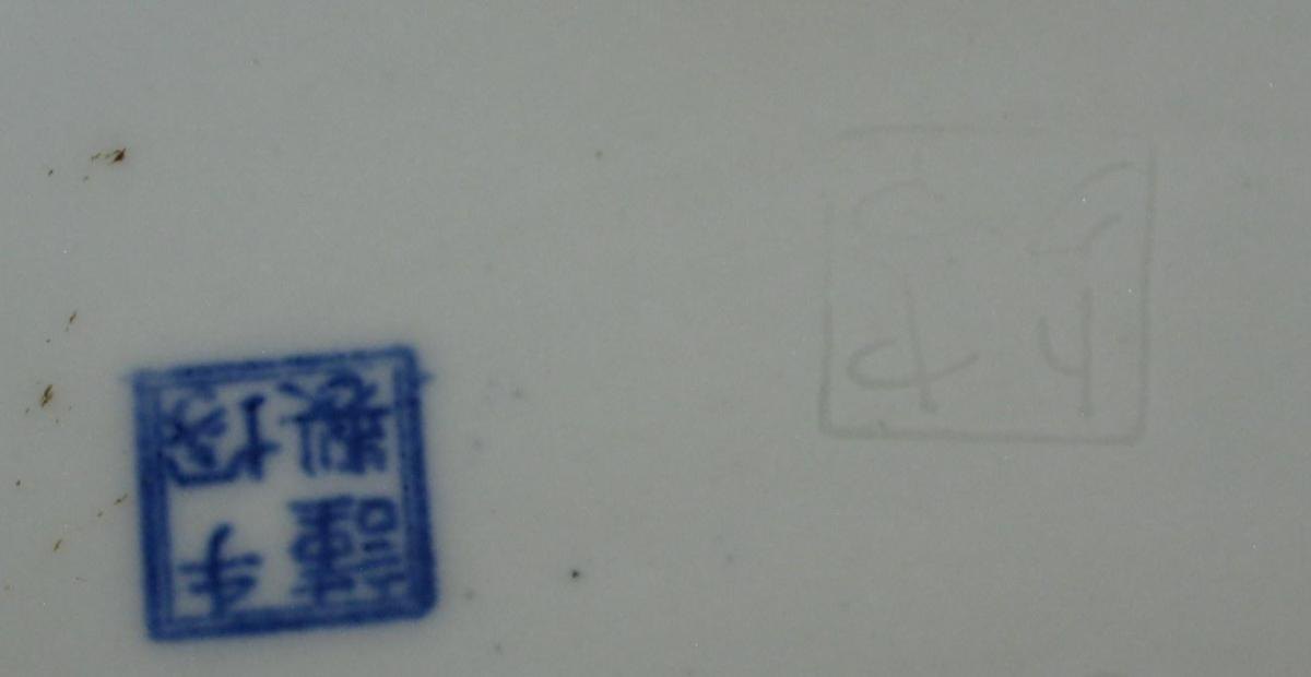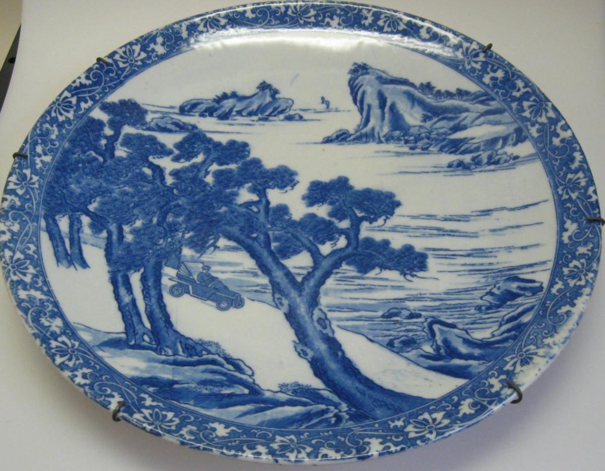 Kinesisk fad, begyndelsen af 20. årh. Dekoreret i blåt i overføringsteknik; landskaber, bil, byer og vand. Dia.: 37 cm. Signeret på bagsiden. Flot stand.