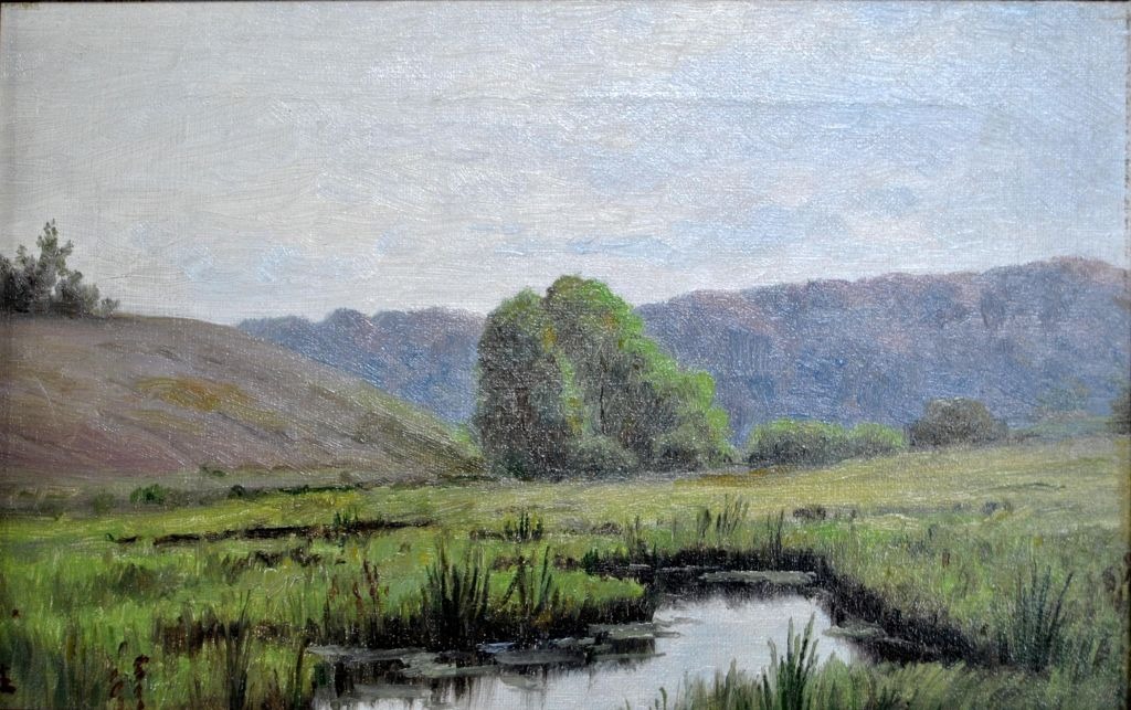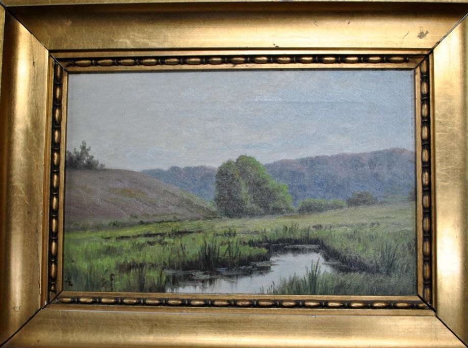 Dansk kunstner (19. årh.): Et åløb. Olie på lærred. Verso signeret: Carl Rasmussen. 19 x 29,5 cm.