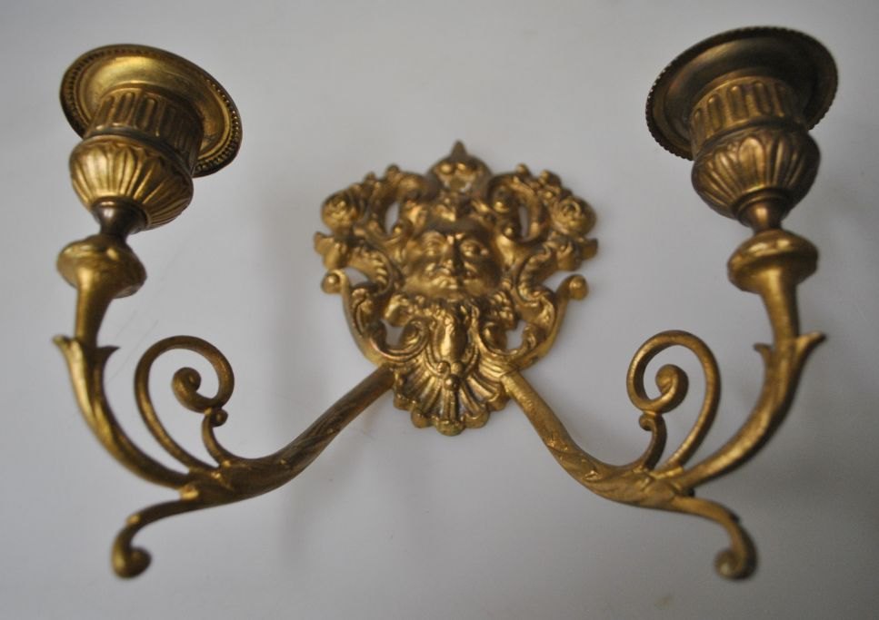Par franske lue forgyldte vægstager, 19. årh. Hver med to lys arme. Dekoreret med maskeroner. B: 18,5 cm. H.: 16 cm.
