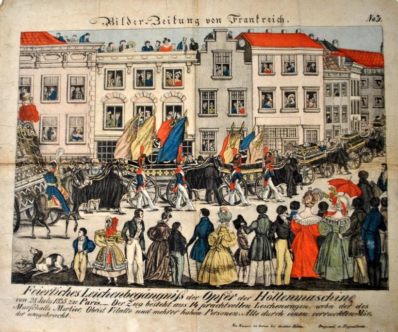 Neu Ruppin tryk (19. årh.) Bilder Zeitung von Frankreich. Feierliches Leichbegängniss der Opfer der Hôllenmaschine. Håndkoloreret litografi. 34,5 x 41 cm.