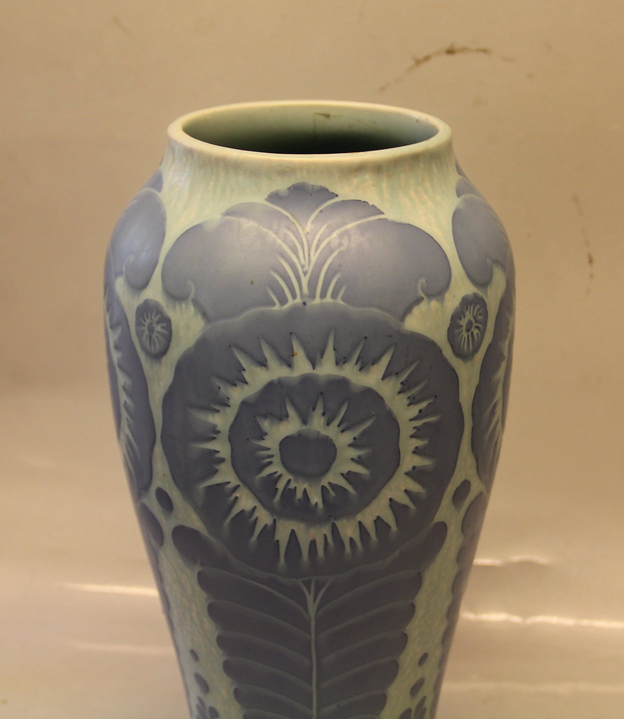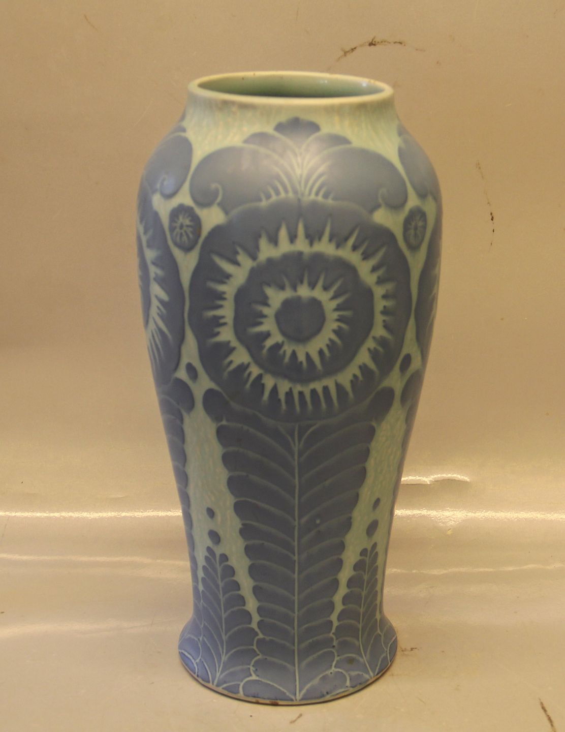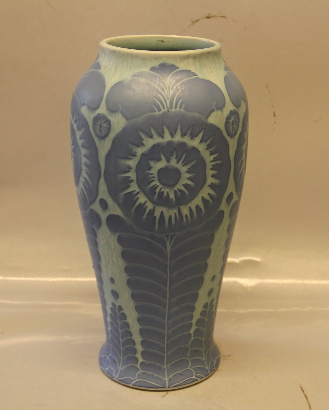 Gustavsberg vase 34 cm, 1918, Sverige. Signeret Josef Ekberg 1918 (1877 - 1945). Keramik i "sgraffito" teknik. Art Nouveau dekoration i relief.