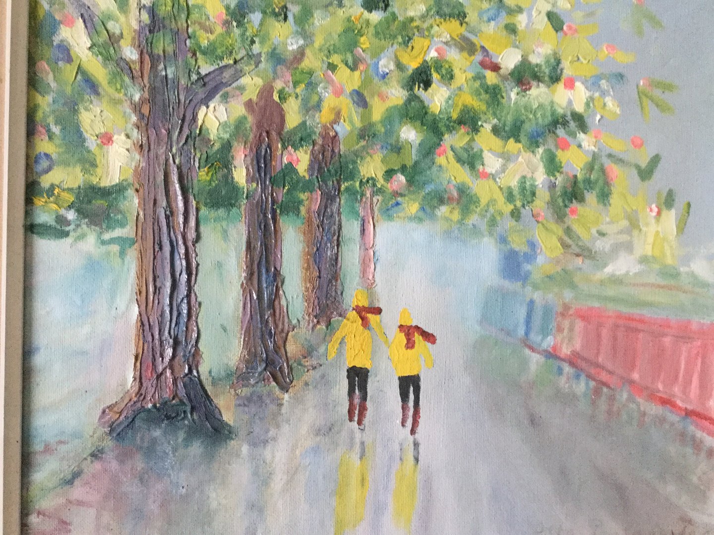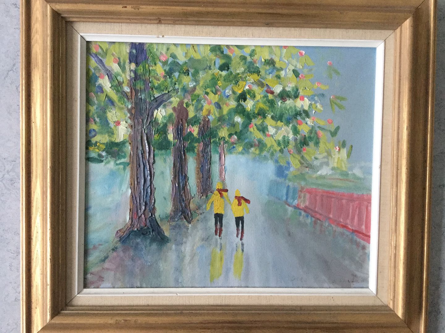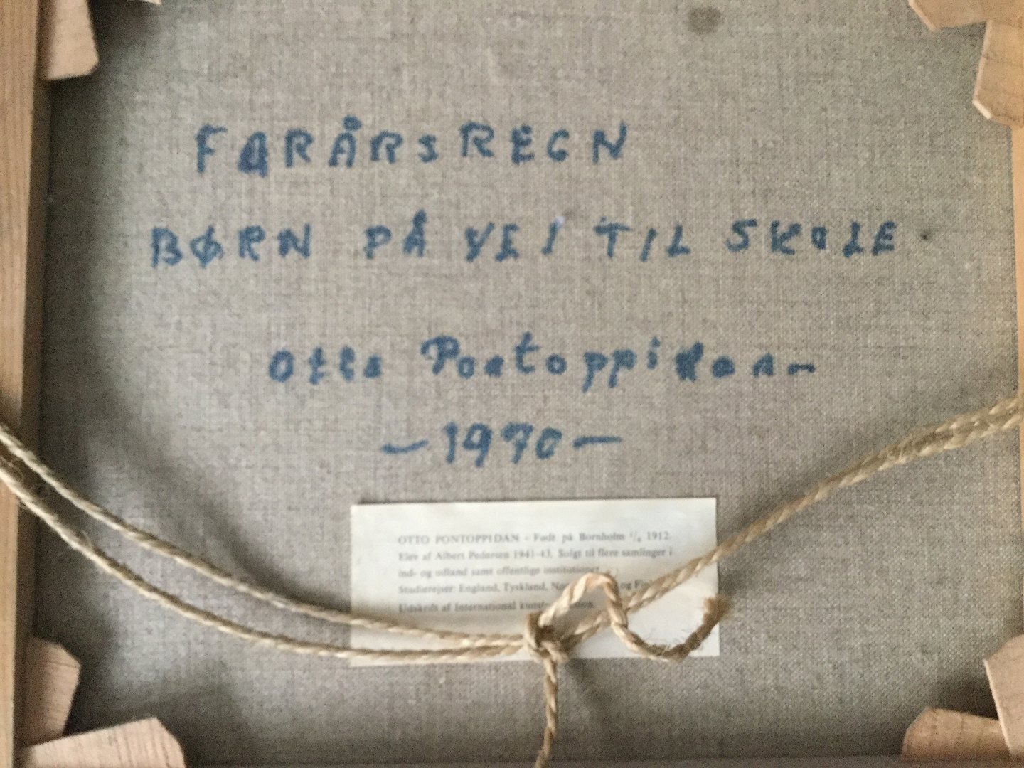 Maleri af Otto Pontoppidan 1970 - Forårsregn - børn på vej til skole.