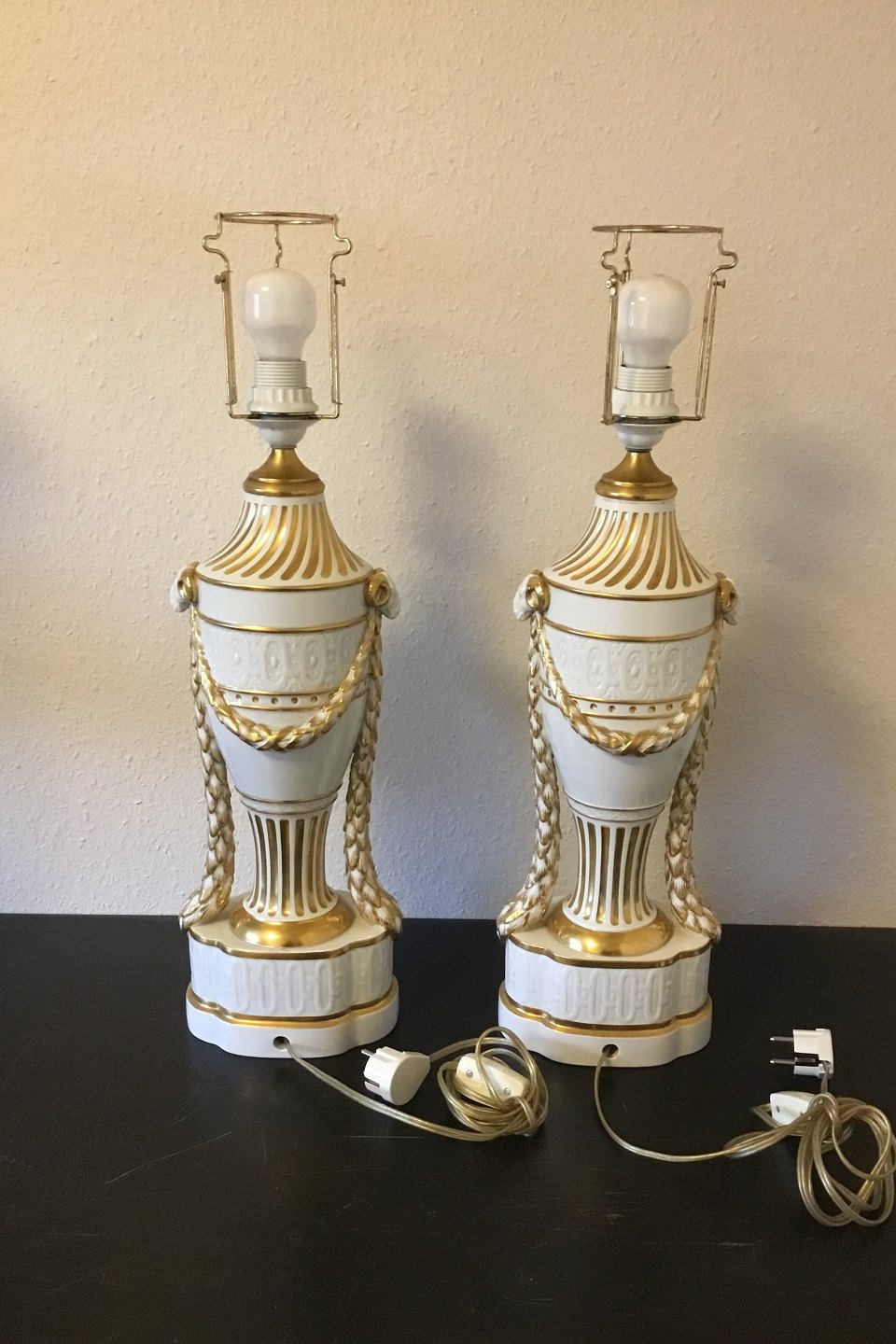 Royal Copenhagen Et sæt på to balusterformede lamper på sokkel dekoreret med guirlander, vædderhoveder og guld. Med Juliane Marie mærke fra 1905-12. Monteret med EL-pærer og ledning. Den ene med hårkarrevne ellers i fin stand. Måler 65 cm incl. fatning.