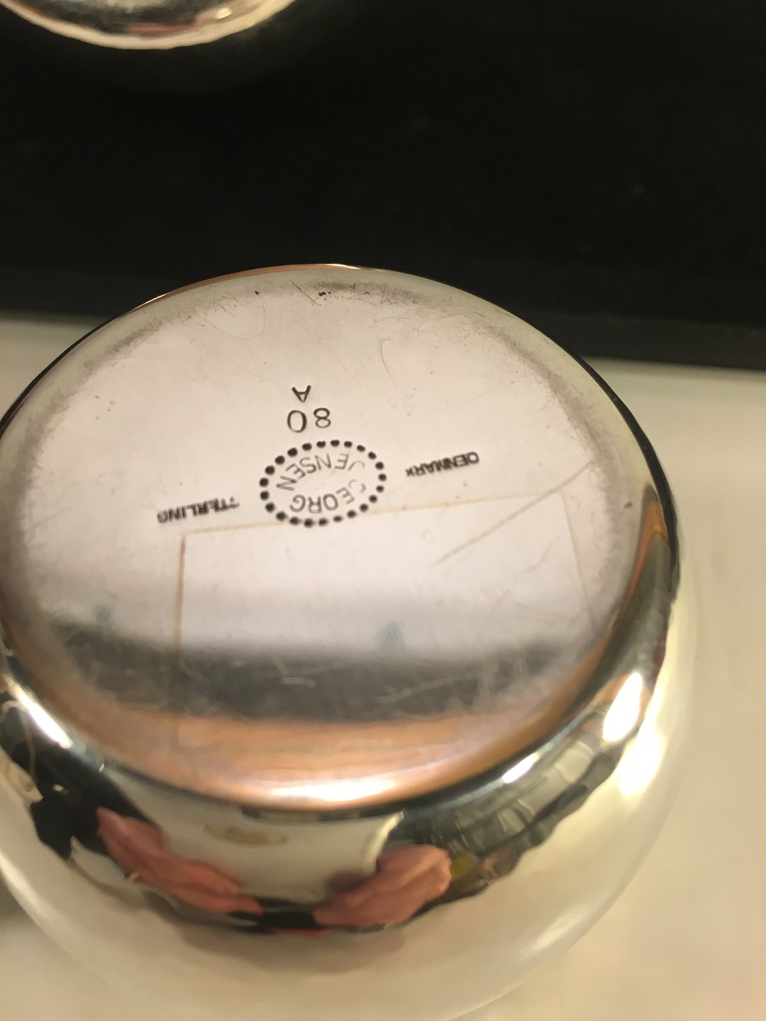 Sukker og flødekande af let hammerslået sterlingsølv 925s , glat buttet korpus, stjerthanke og lågknopper af sort ibenholt. Dessin 80 A.