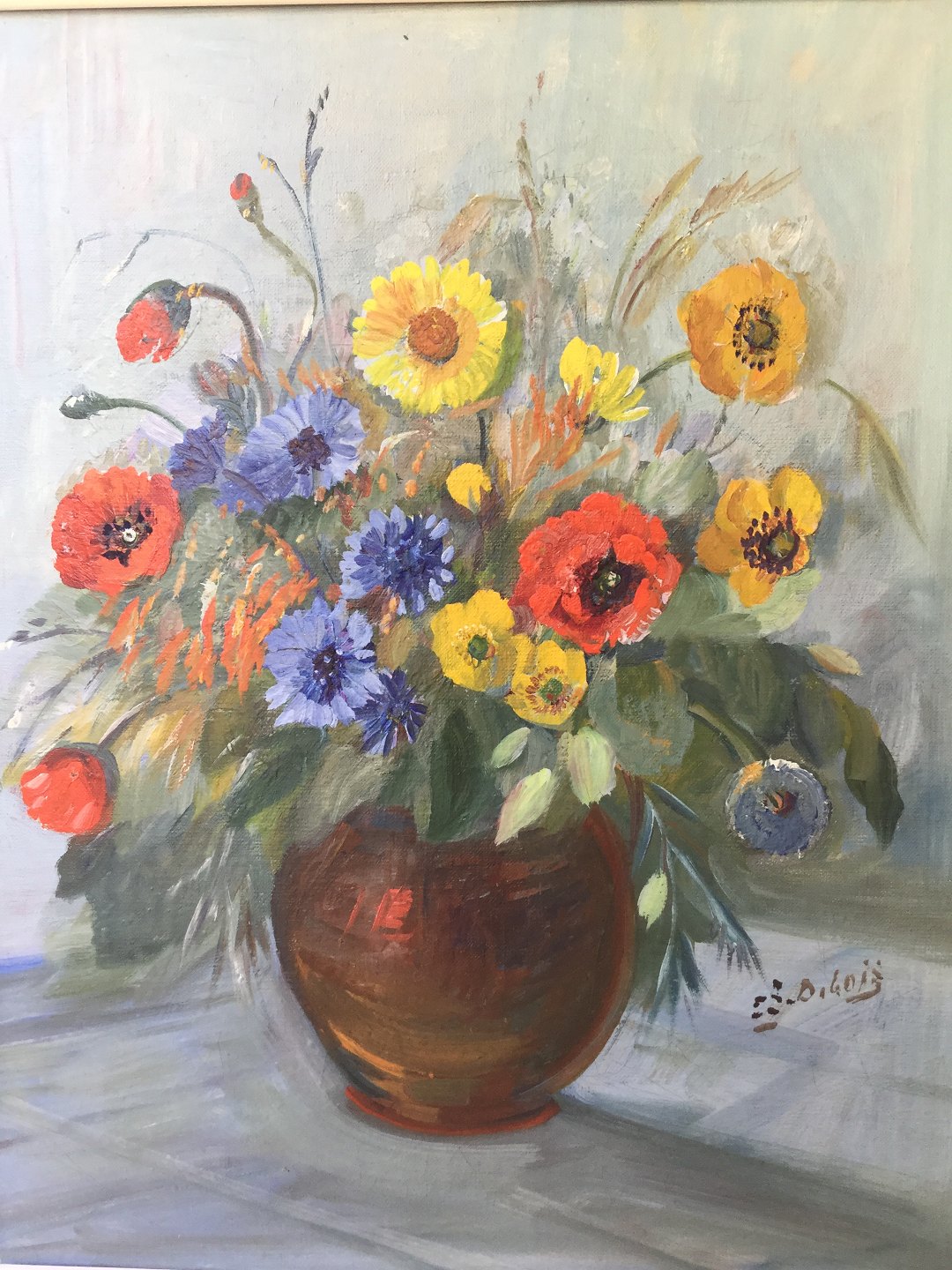 Maleri af Ingeborg Debois - Vase med valmuer, kornblomster m.fl.