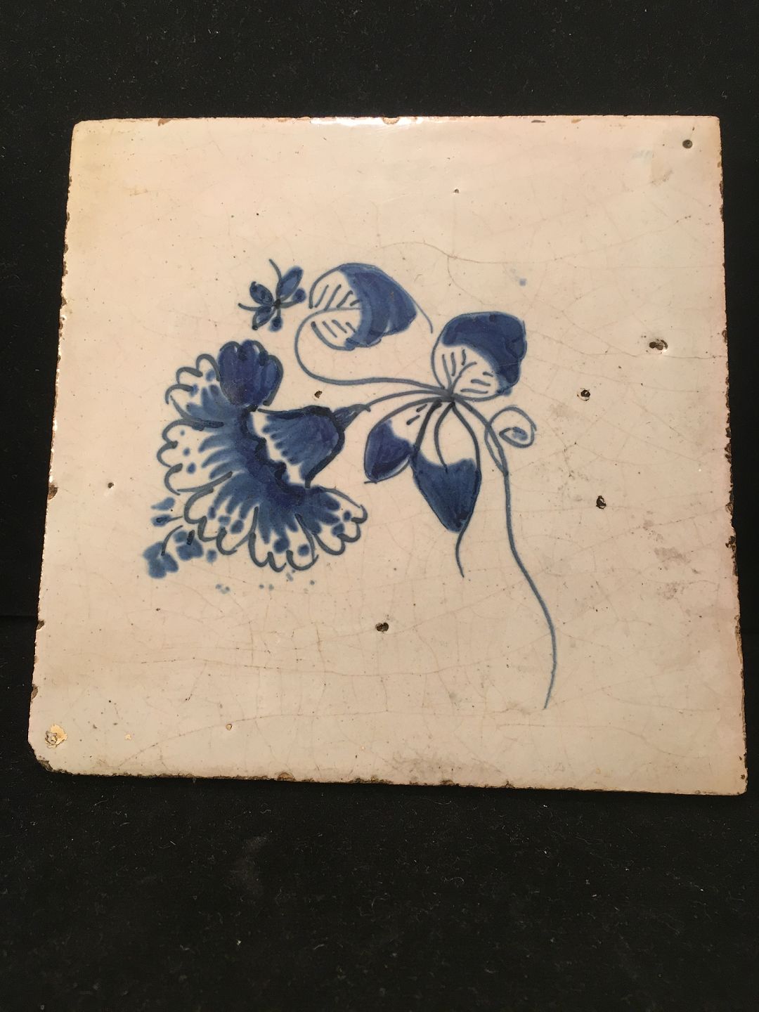 fra 1700 tallets slutning, med blomster (musselmalet mønster) og insekter. Blå dekoreret. mål. 13 x 13 cm
