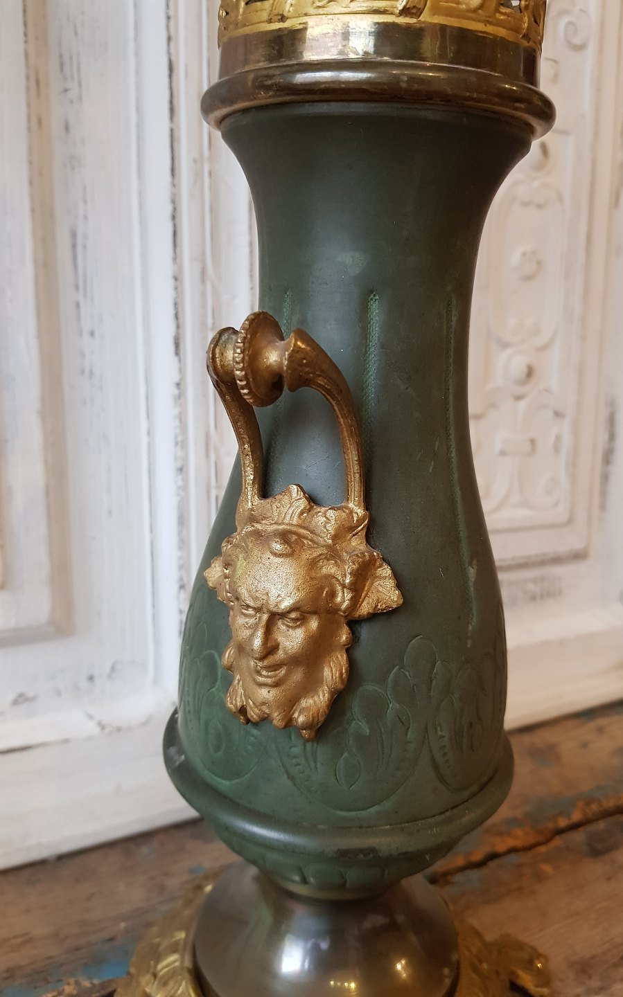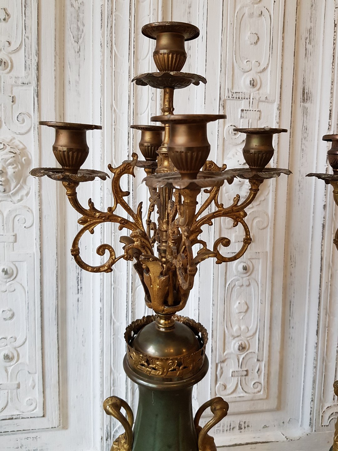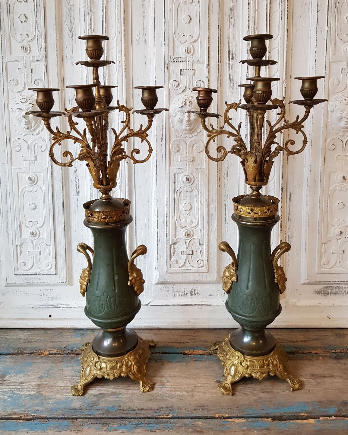 | Pair of 1800's French 5-armed candelabra. The base of green patinated metal is adorned with gilded mascarones, feet and top gilt metal. Height 63 cm.