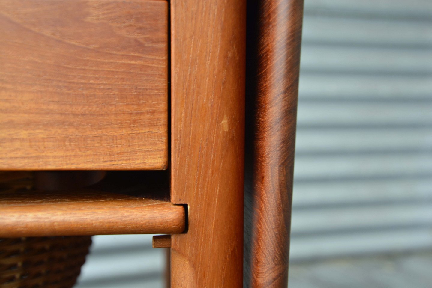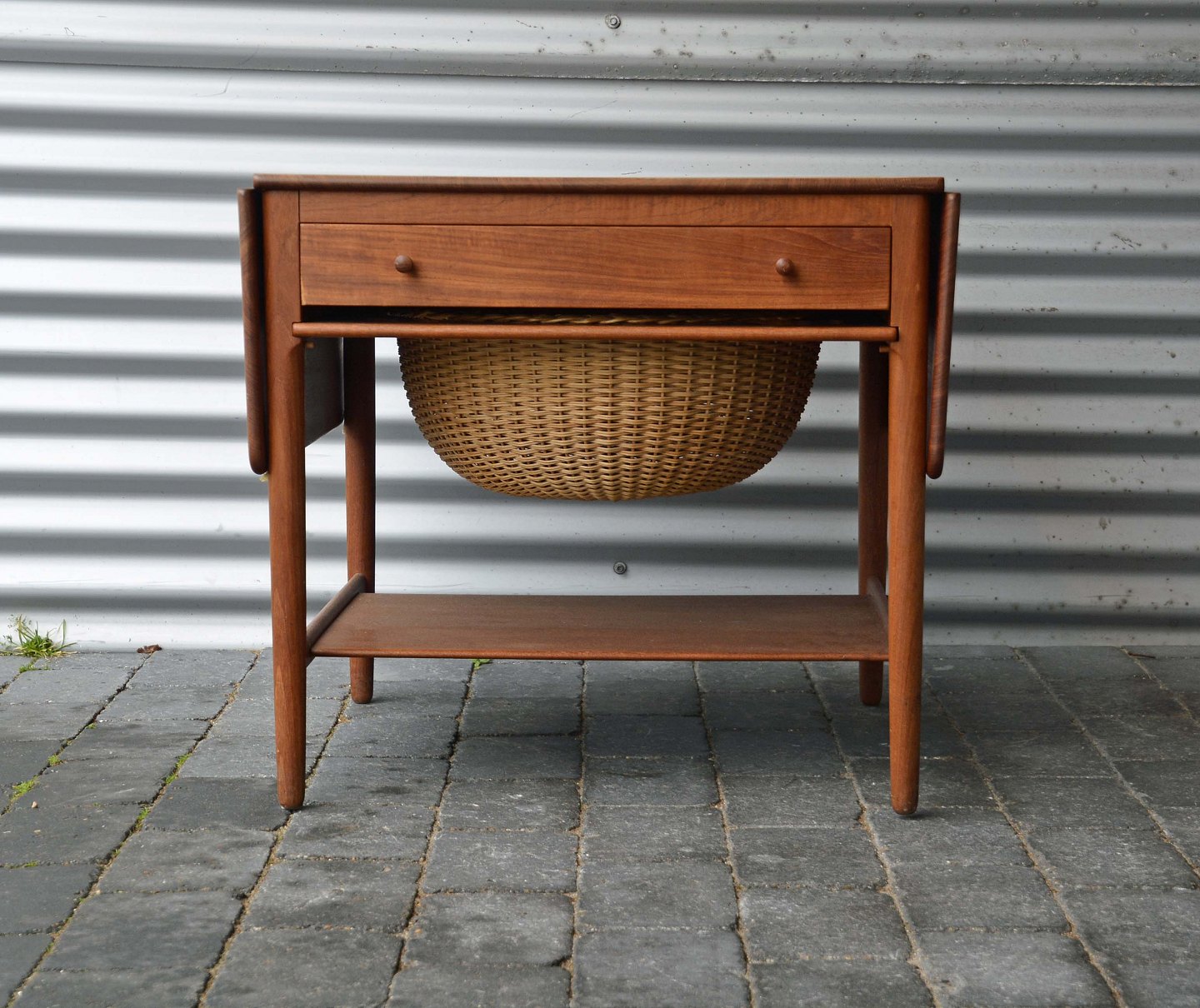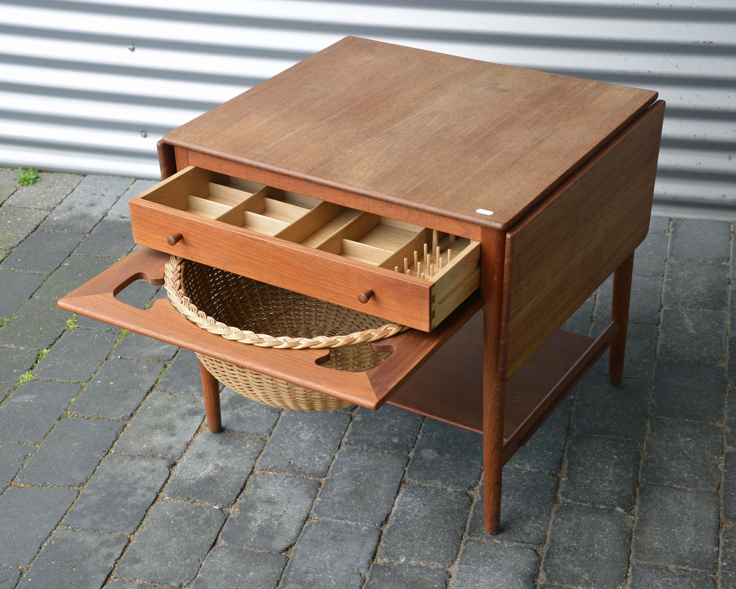Sybord i teak, designet af Hans J Wegner. Alt er i teak på nær det indvendige af skuffen.