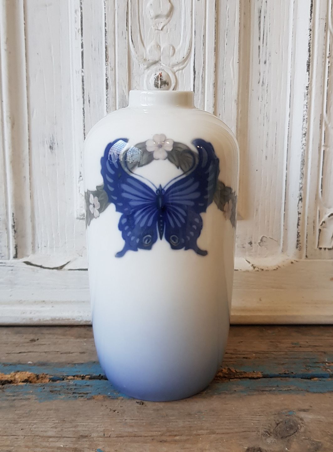 Royal Copenhagen Art Nouveau vase dekoreret med sommerfugl.