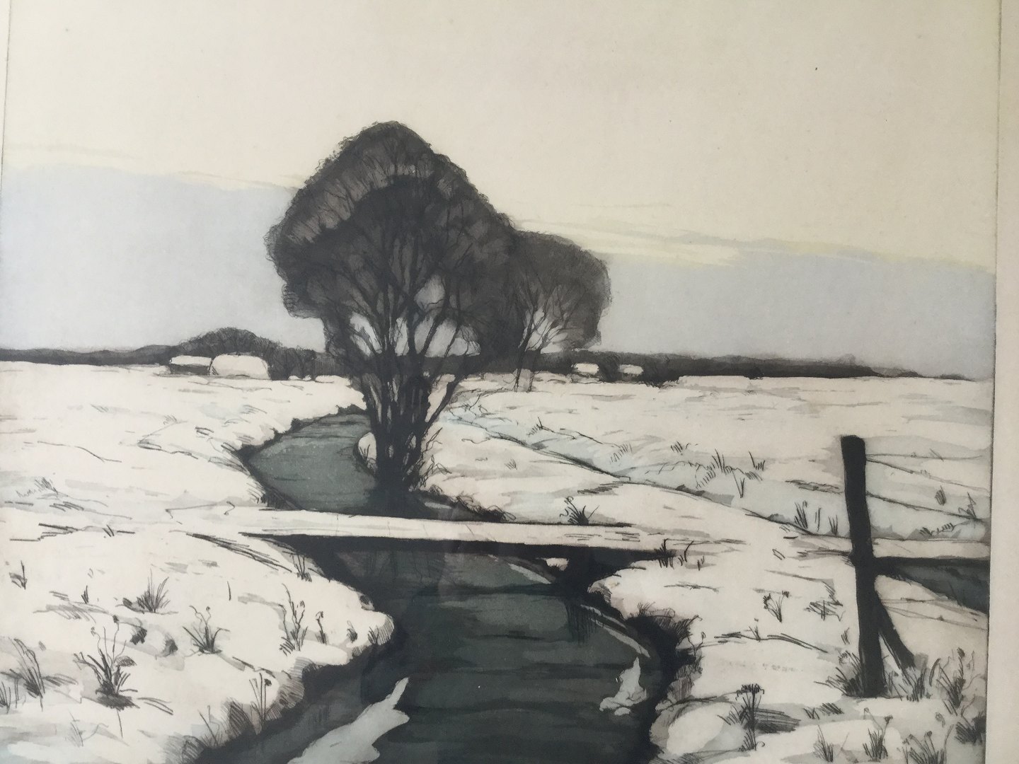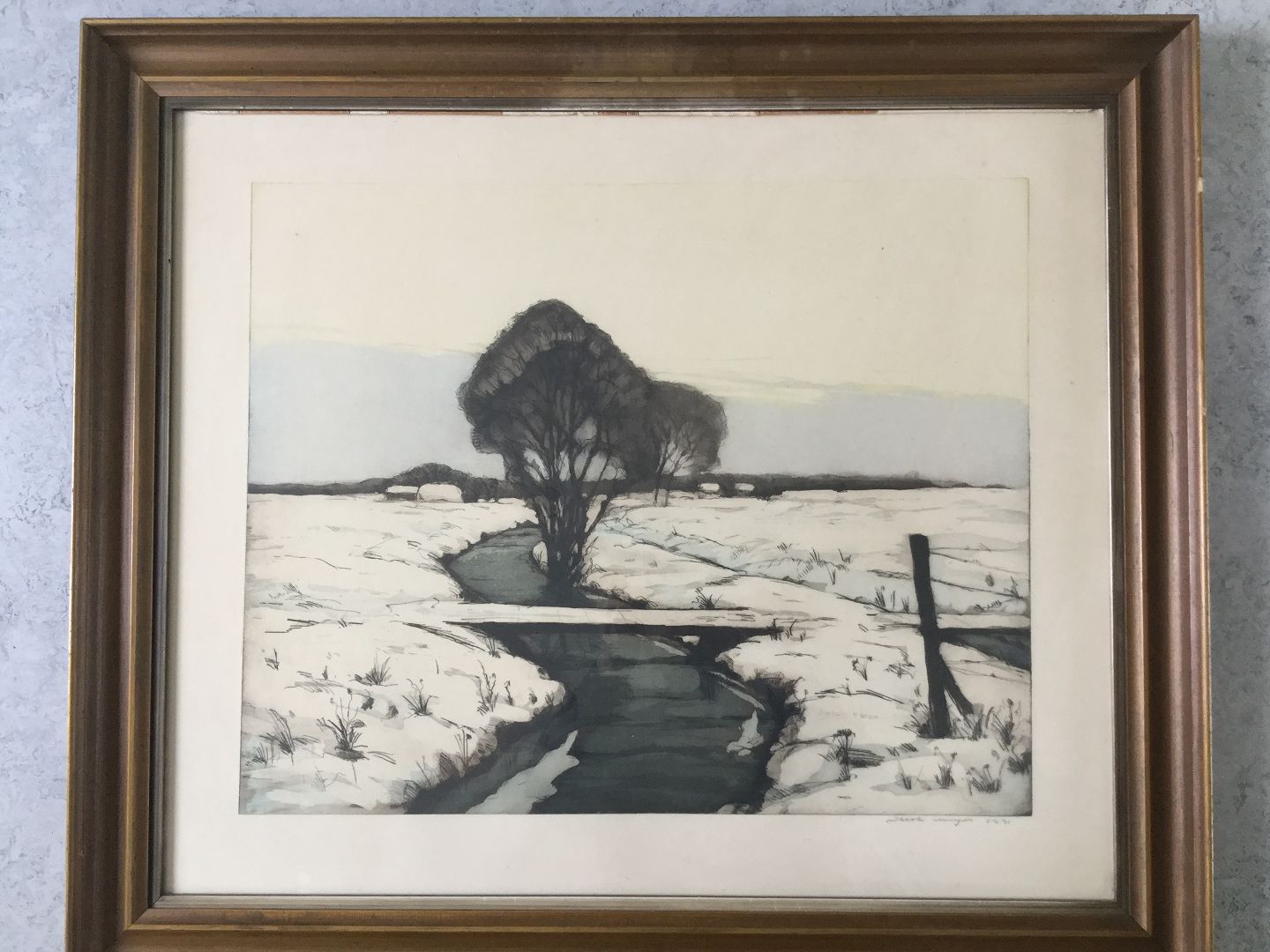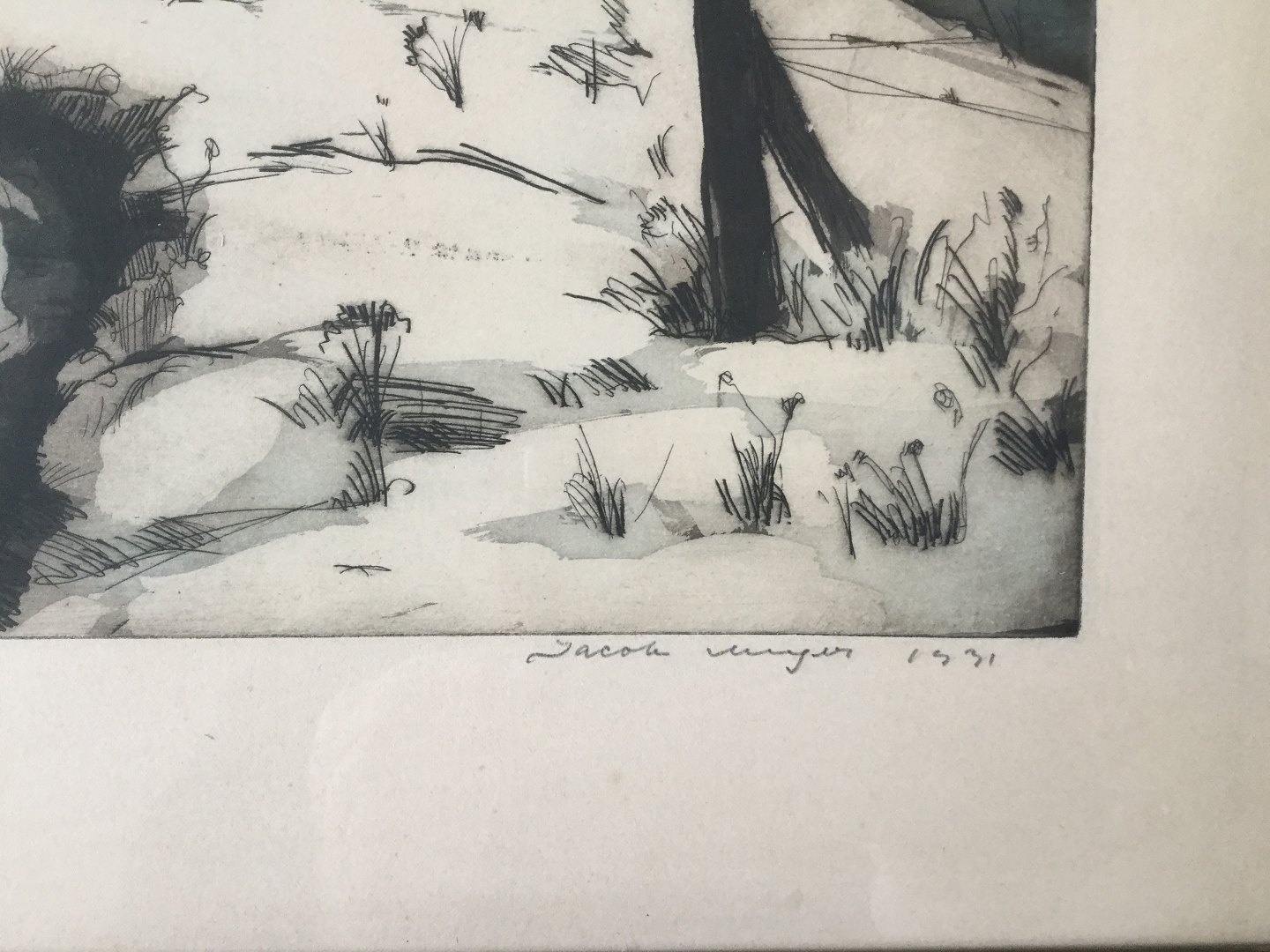 Radering af Jacob Meyer 1931 - Vinterlandskab med å.