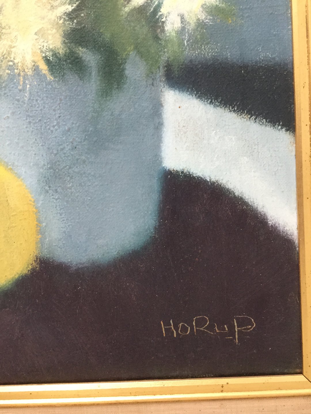 Maleri af Knud Horup - Opstilling ved vindue - vase med blomster og frugt.