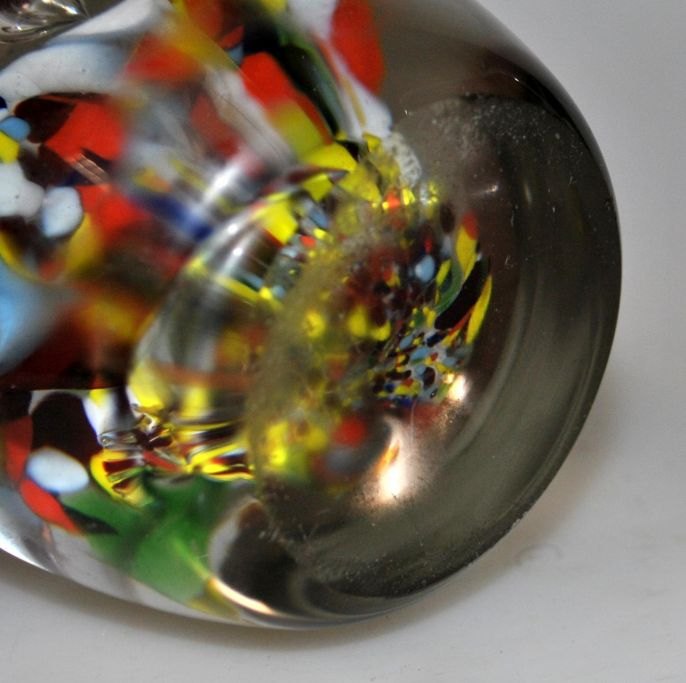 Brevpresse i klart glas, ca. 1900. Danmark. Indvendig med forskelligt farvet glas og luft bobler. Højde.: 8,5 cm.