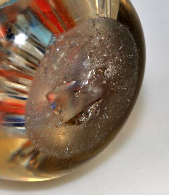 Brevpresse i klart glas, ca. 1900. Danmark. Indvendig med forskelligt farvet glas og luft bobler. Højde.: 10 cm.