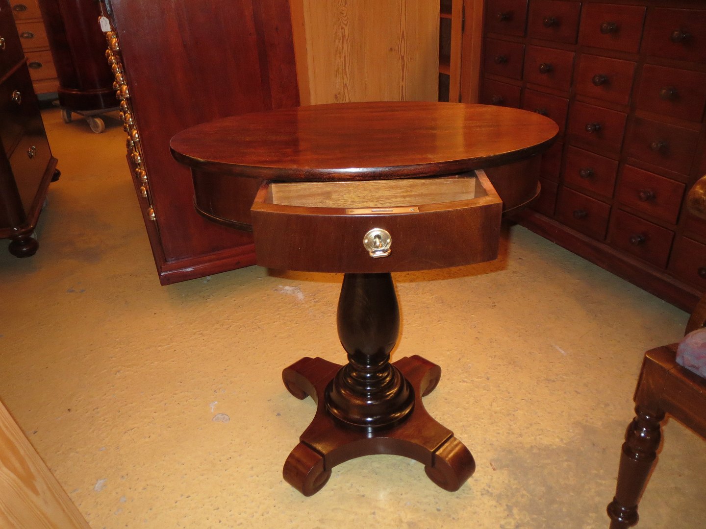 Ovalt Mahogni Lampebord med 1 skuffe Restaureret Håndpoleret Mål H 69, D 44, B 66,cm. 2835/P