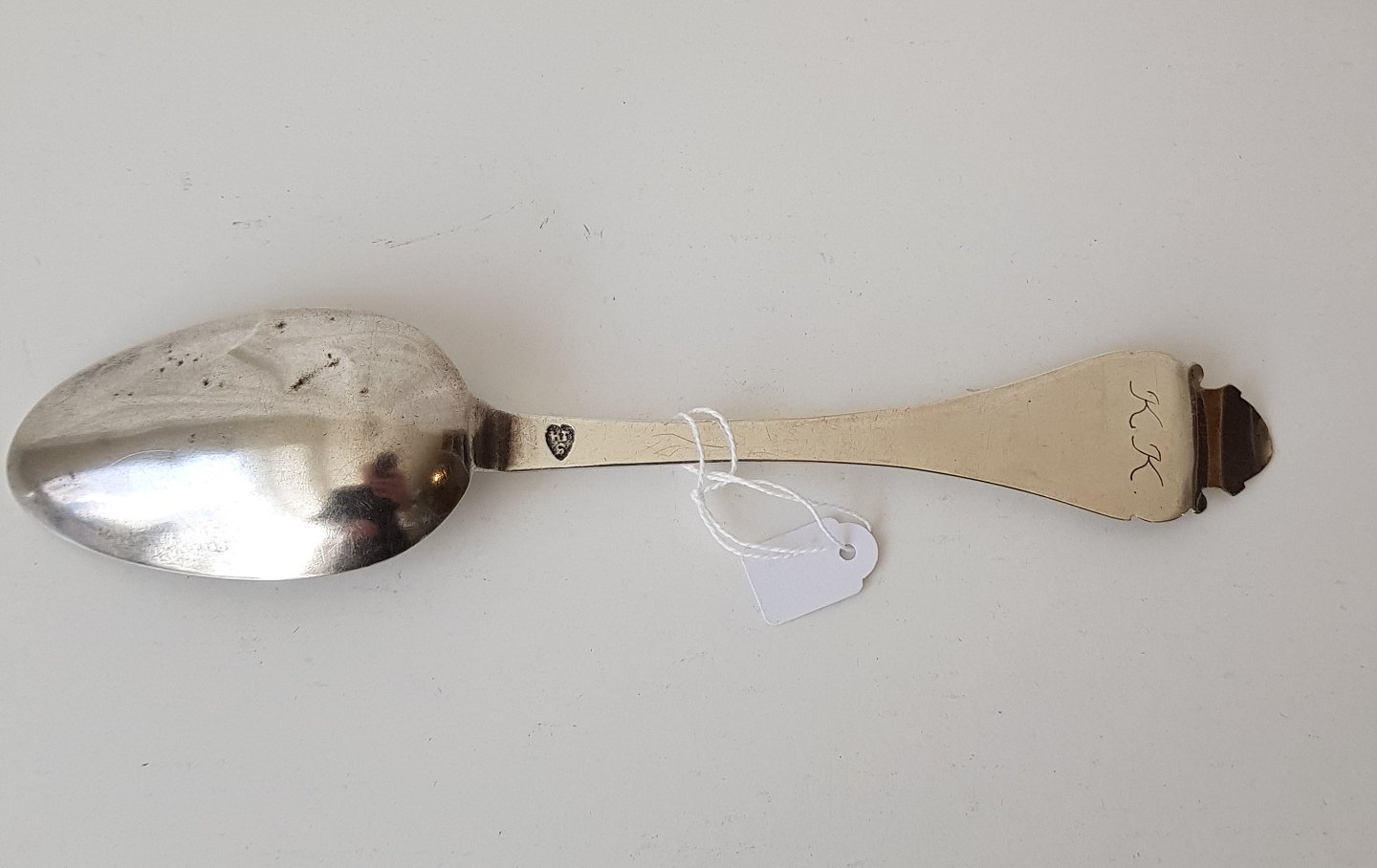 Barok spiseske i sølv 1700tallets 2. halvdel. Stempel HFS i hjerte, er lavet af Hinrich Friedrich Schrøder, Meldorf. Gift 1763 og 1794 i Glückstadt. Død 1802 i Meldorf