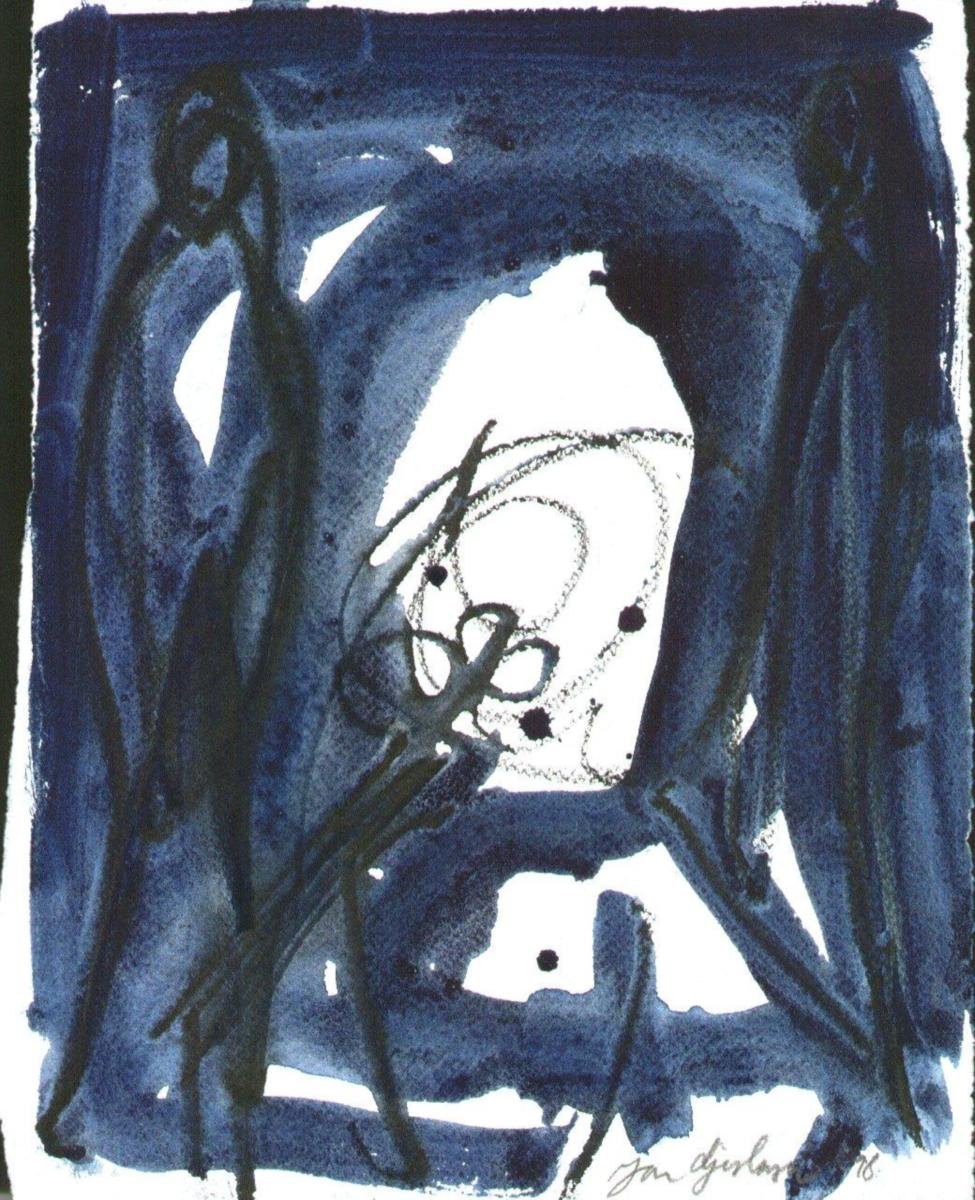 Gislason, Jon (1955-): Komposition med to personer med en blå baggrund. Akvarel/tusch på papir. Sign.: Jon Gislason 98. (1998). 42 x 30 cm.
