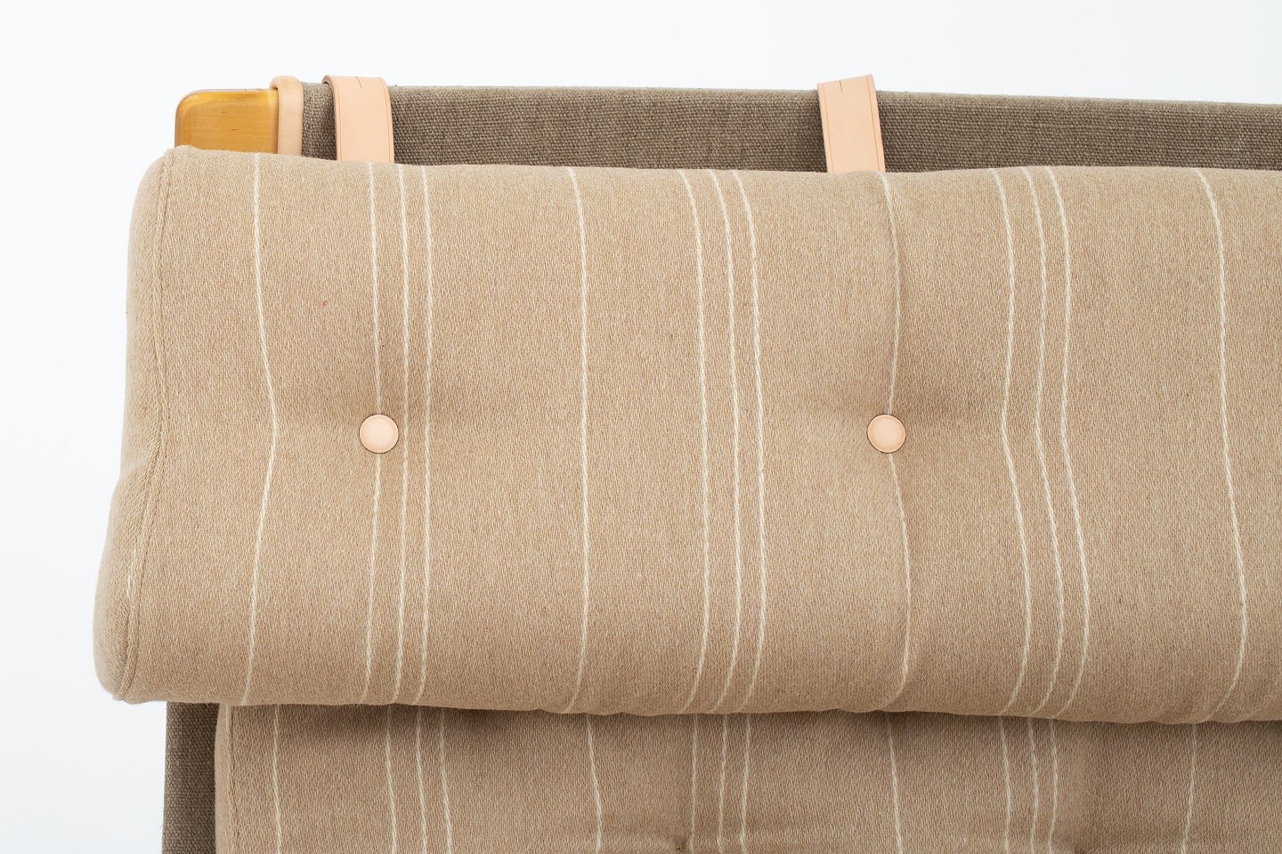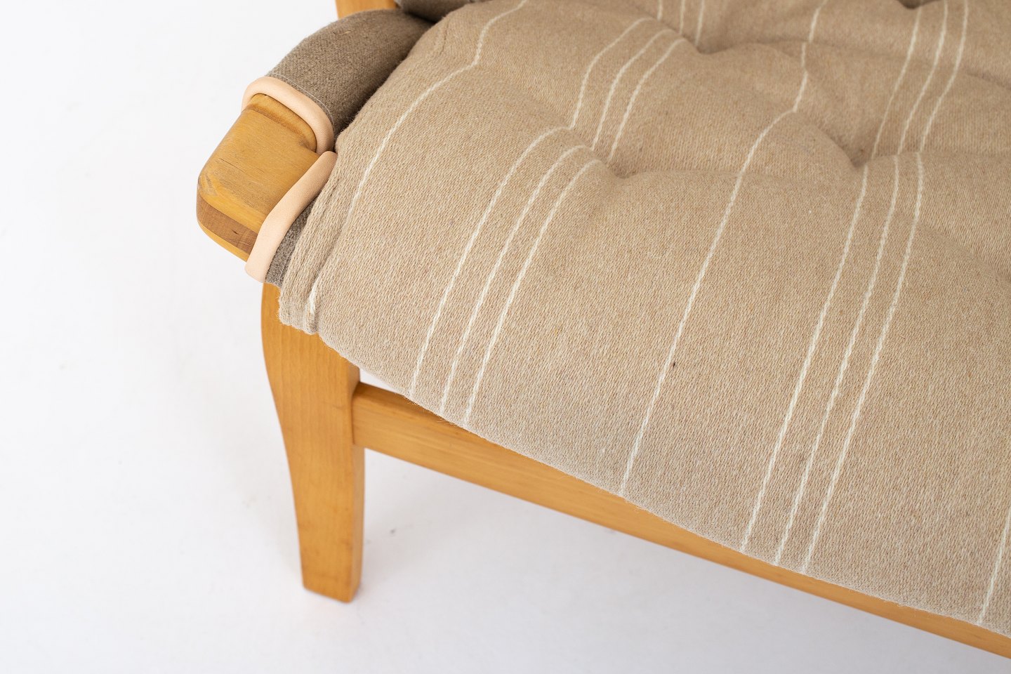 Pernilla 69 - Nybetrukket lænestol i bøg med Aalborg Møbelstof (Dessin A, farv. 11). KLASSIK tilbyder polstring af lænestolen med stof eller læder efter eget ønske. Kontakt os venligst for mere information.