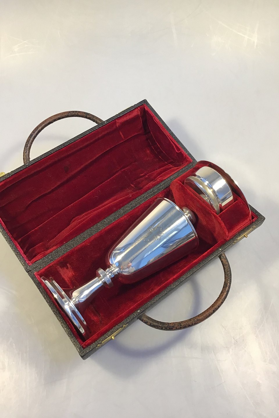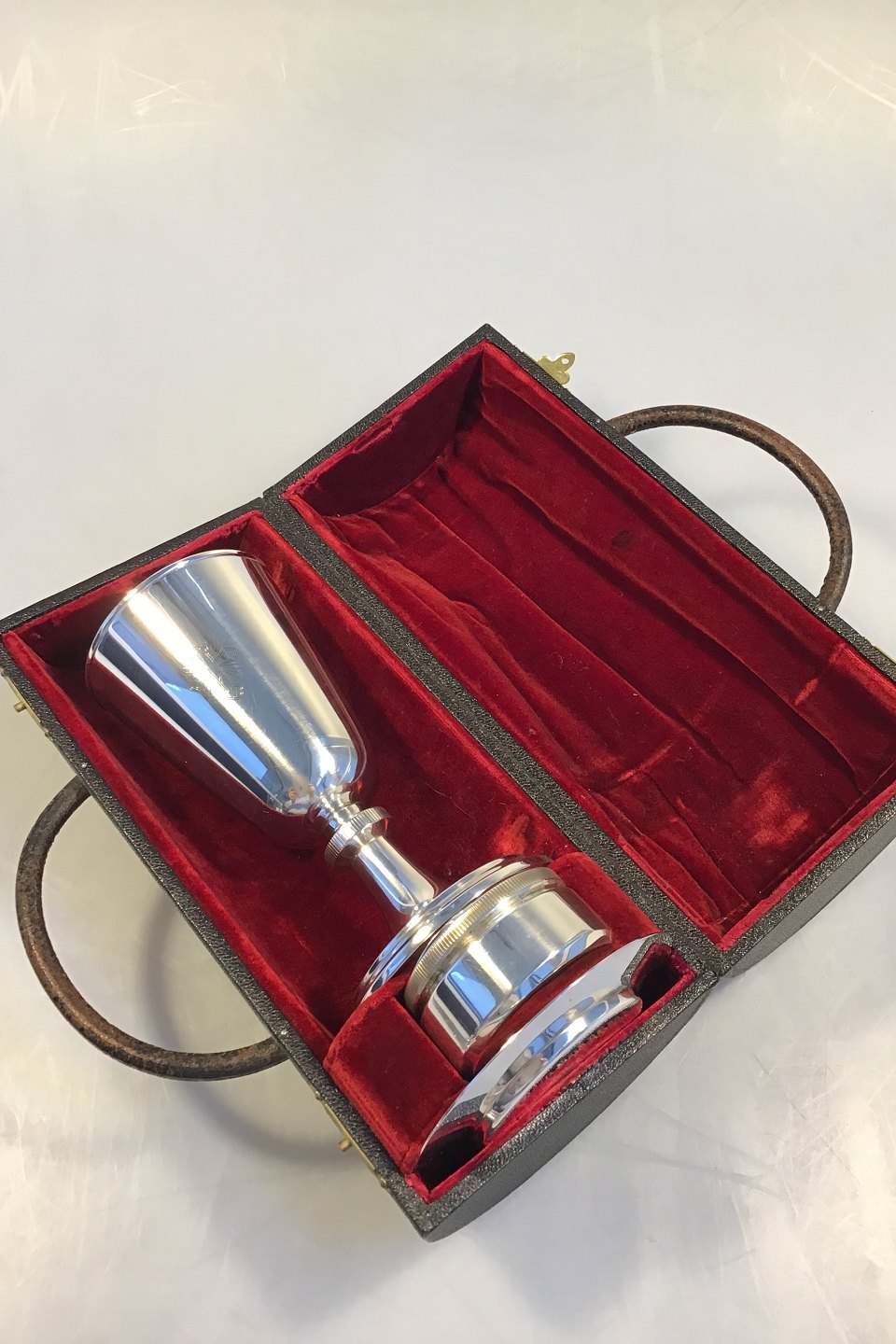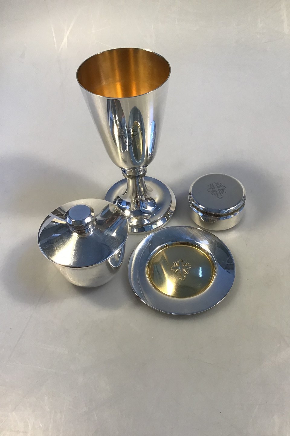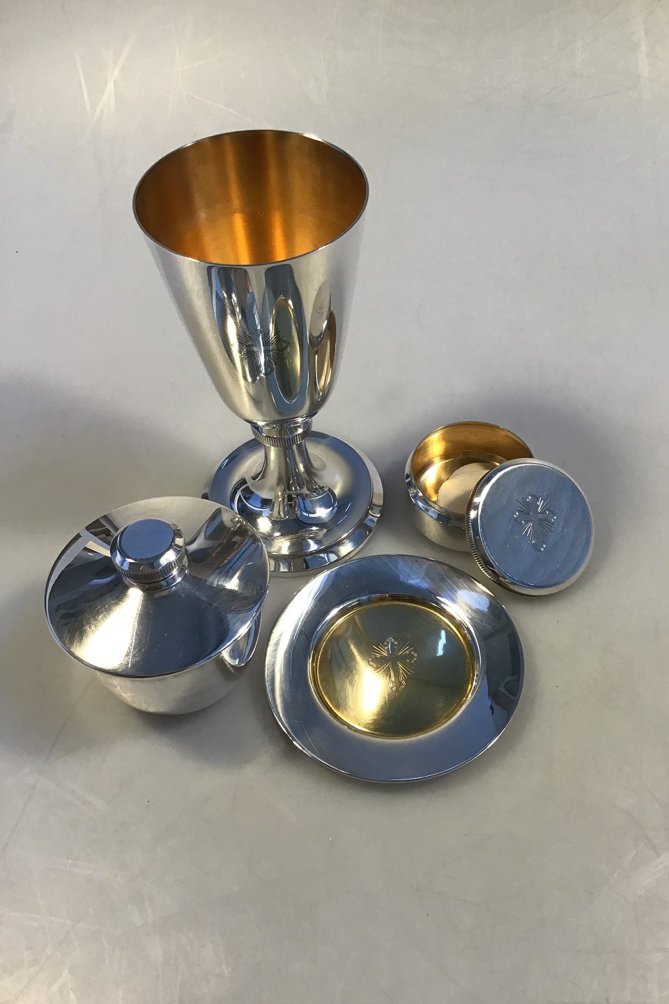 C.C. Hermann Hjemmeberettelsessæt Sterling Sølv Sættet består af kalk, oblatfad, oblatæske og beholder. Delvis forgyldt. Med tilhørende etui. Måler H. 18 cm. Diam. 9 cm Vægt 360 gr