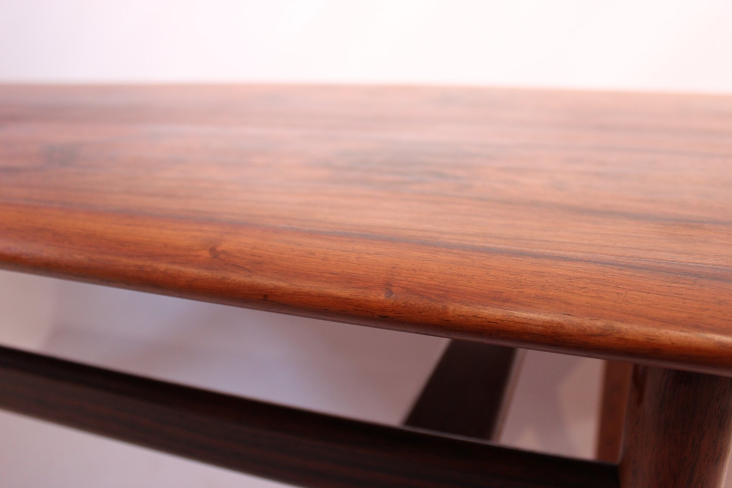 Dette sofabord er en smuk repræsentation af dansk design fra 1960'erne, udført i rig palisandertræ. Palisander, også kendt som rosentræ, er eftertragtet for sin dybe, lækre korn og varme toner, der tilføjer en luksuriøs fornemmelse til ethvert interiør.