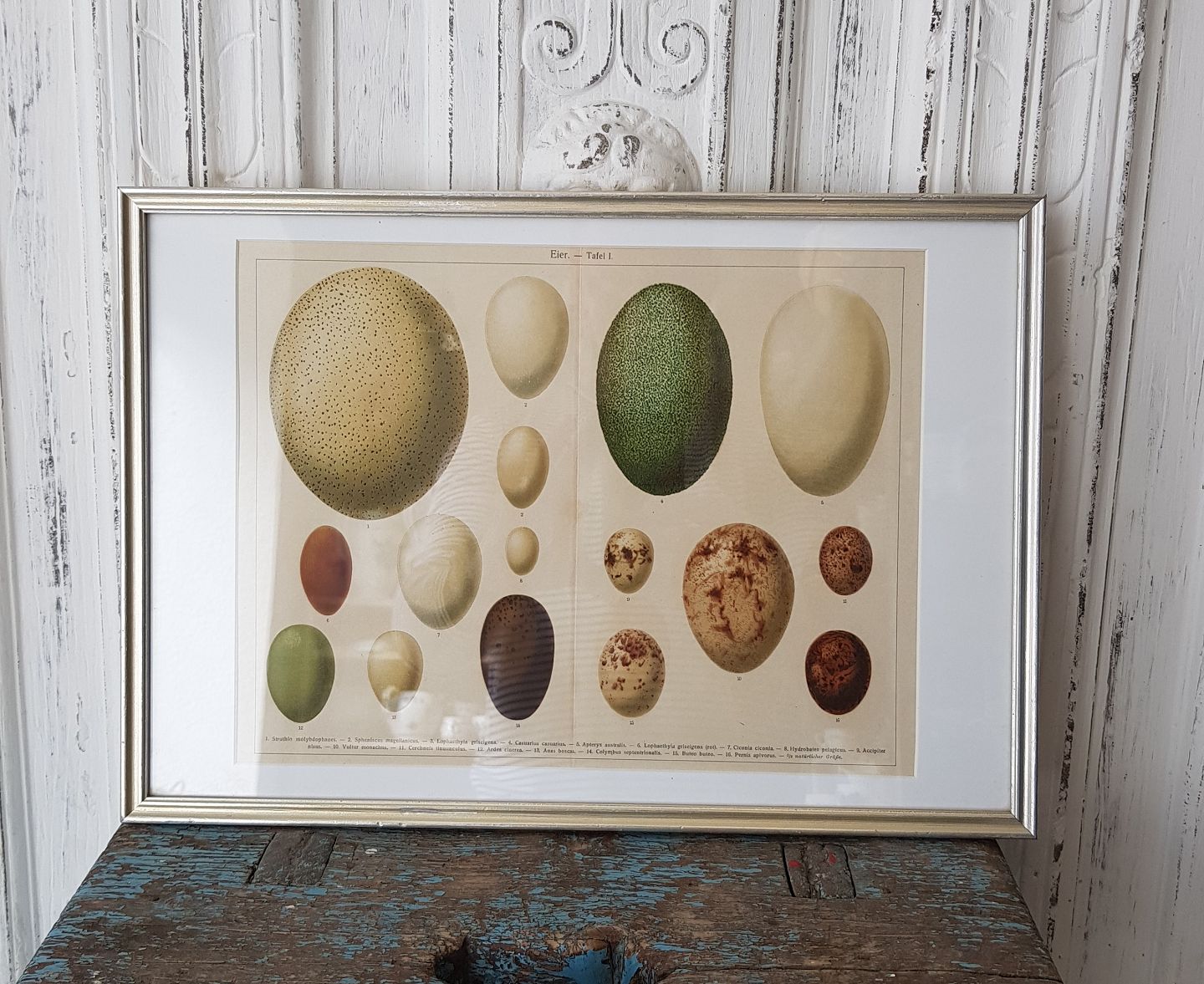 1800s hand-colored print with eggs in beautiful silver frame